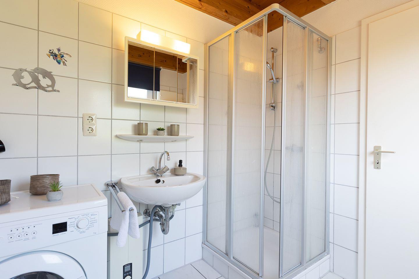 Das Bad mit Dusche, Wanne und Fenster wird durch Waschmaschine, Wäscheständer, Bügeleisen und Haartrockner ergänzt, praktisch für Familien und längere Aufenthalte. Sichtschutz an den Fenstern sorgt für Privatsphäre.