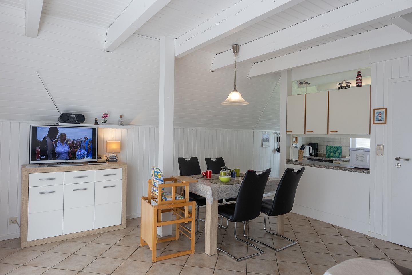 In der offenen Küche mit Spülmaschine, Ceranfeld und Mikrowelle ist alles für Familienmahlzeiten vorhanden. Kinderbett, Hochstuhl, Treppengitter und Steckdosensicherungen machen das Haus besonders familienfreundlich.