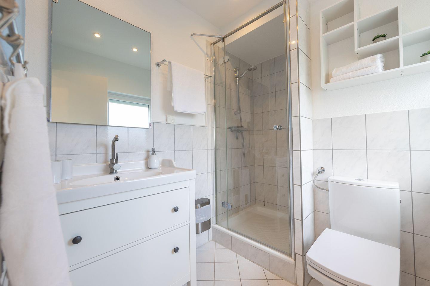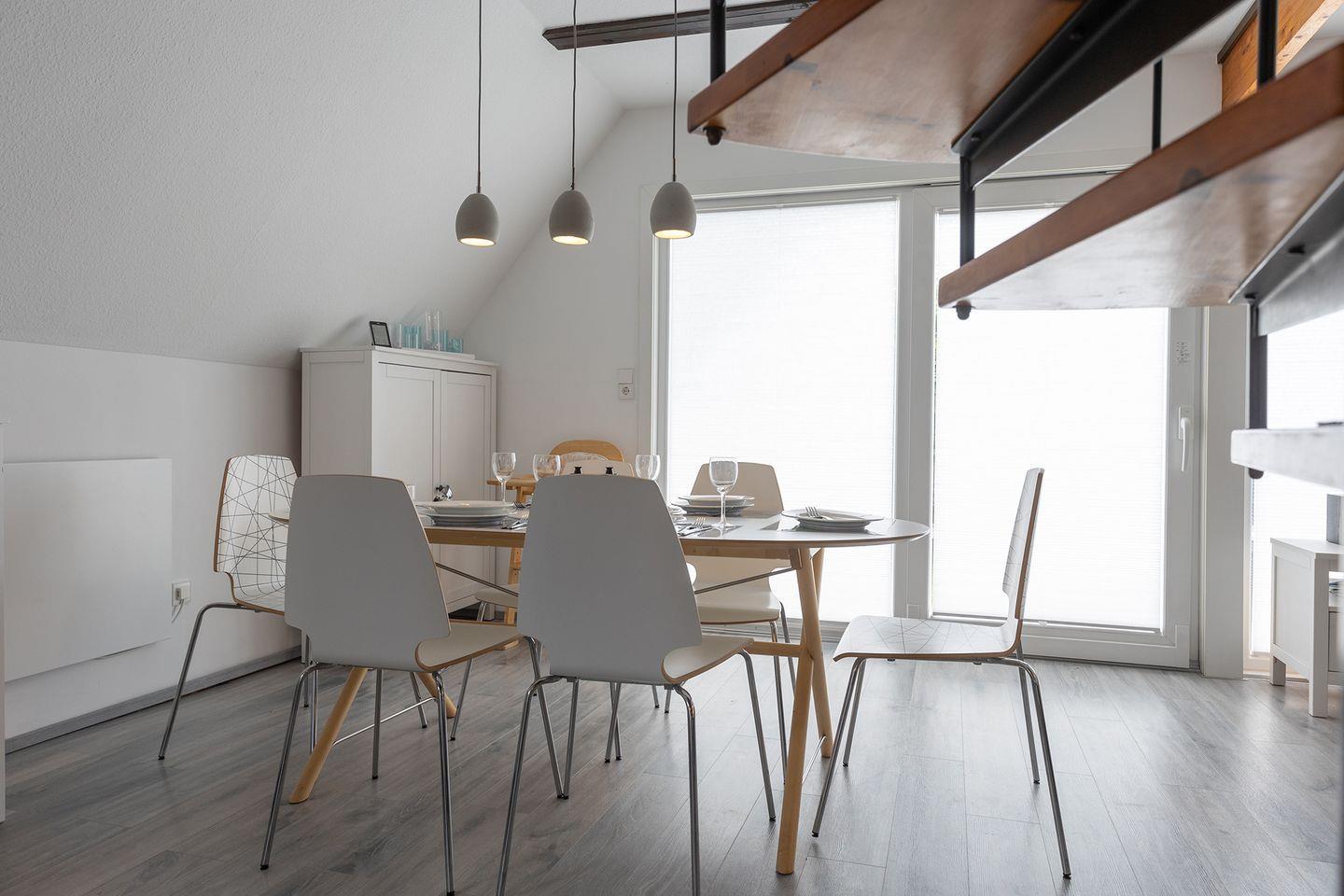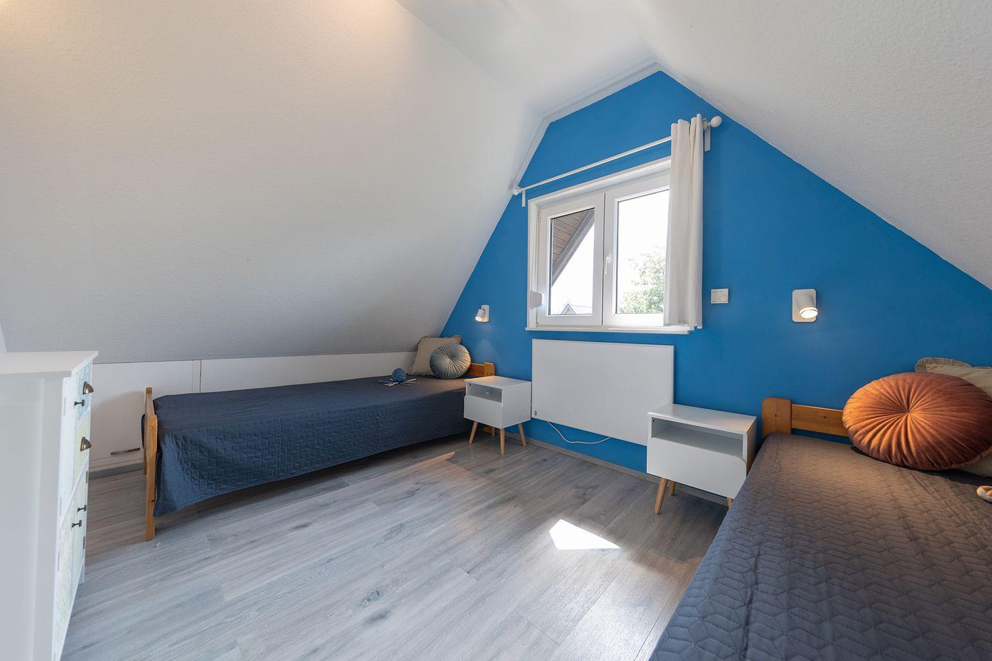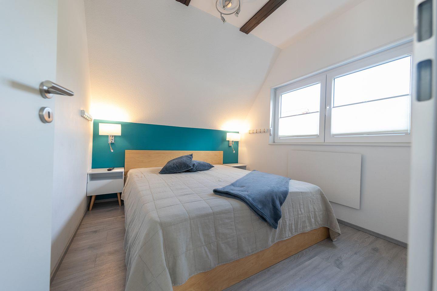 Im Erdgeschoss liegen ein Wohn-Essbereich mit moderner Küche, ein Schlafzimmer mit Doppelbett und ein Duschbad mit WC. Zwei weitere Schlafzimmer sowie ein zusätzliches WC befinden sich im Obergeschoss.