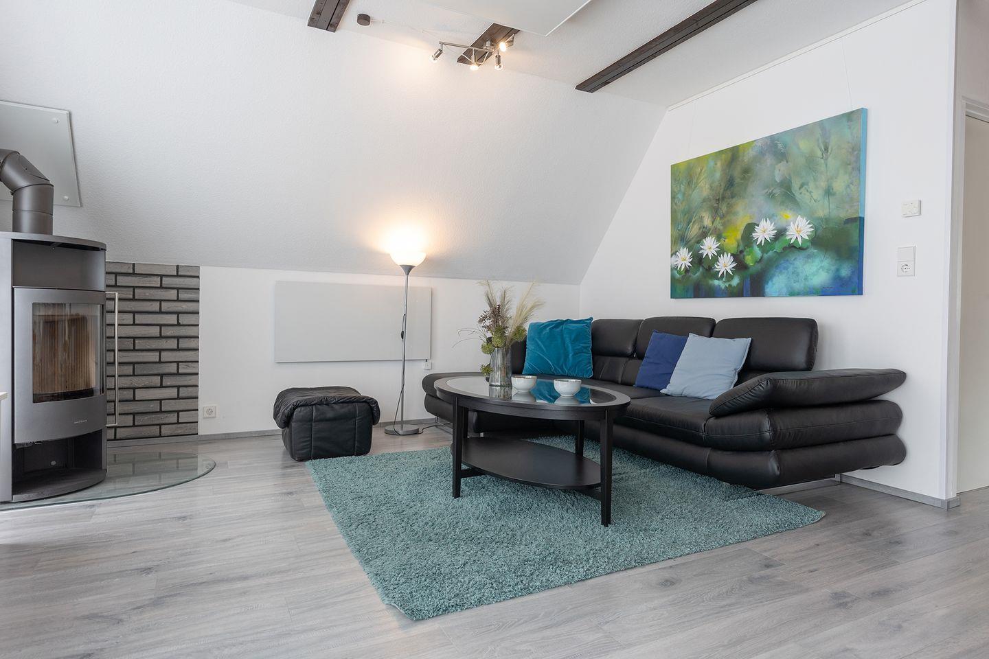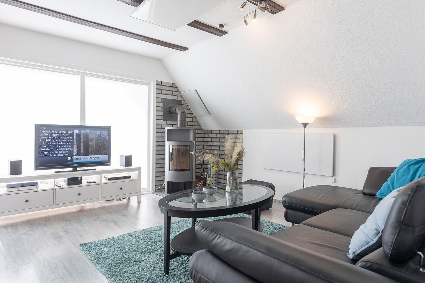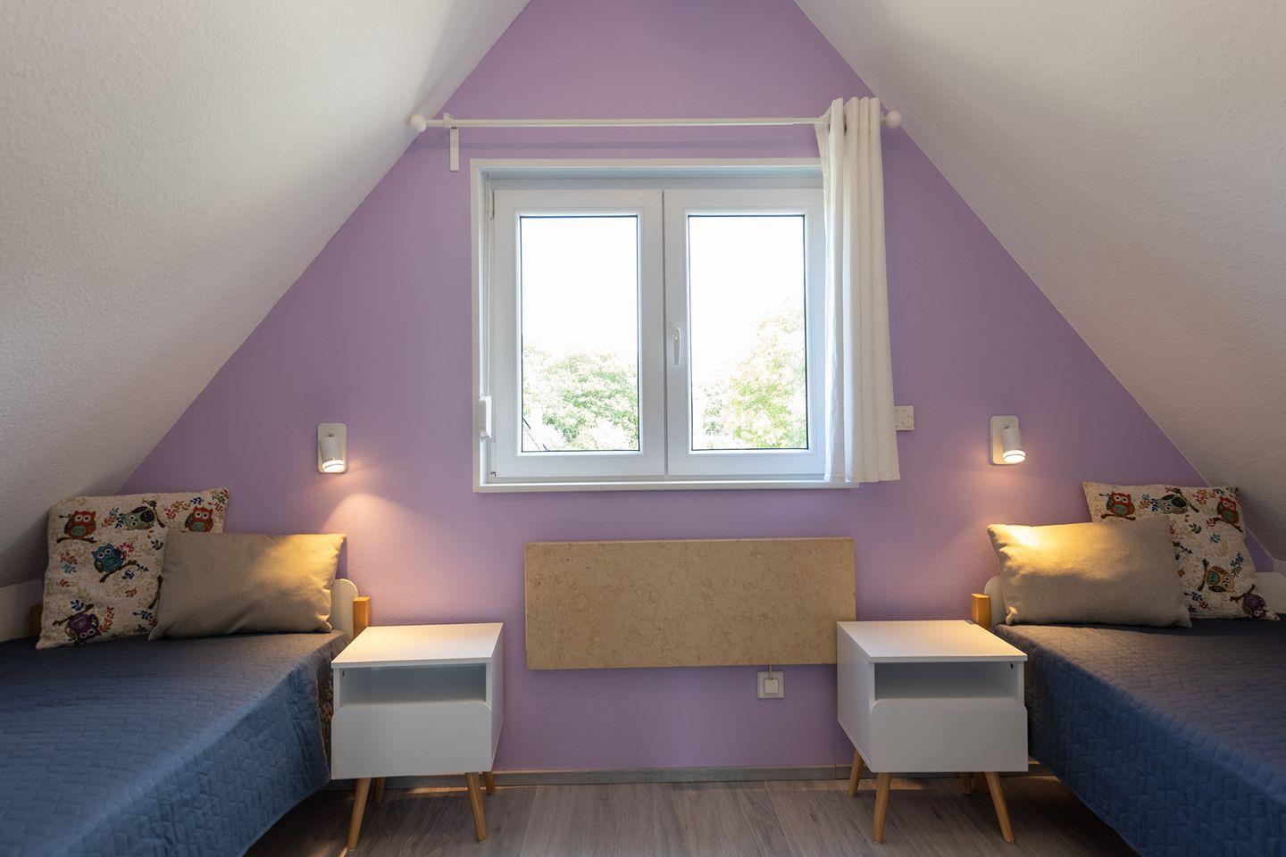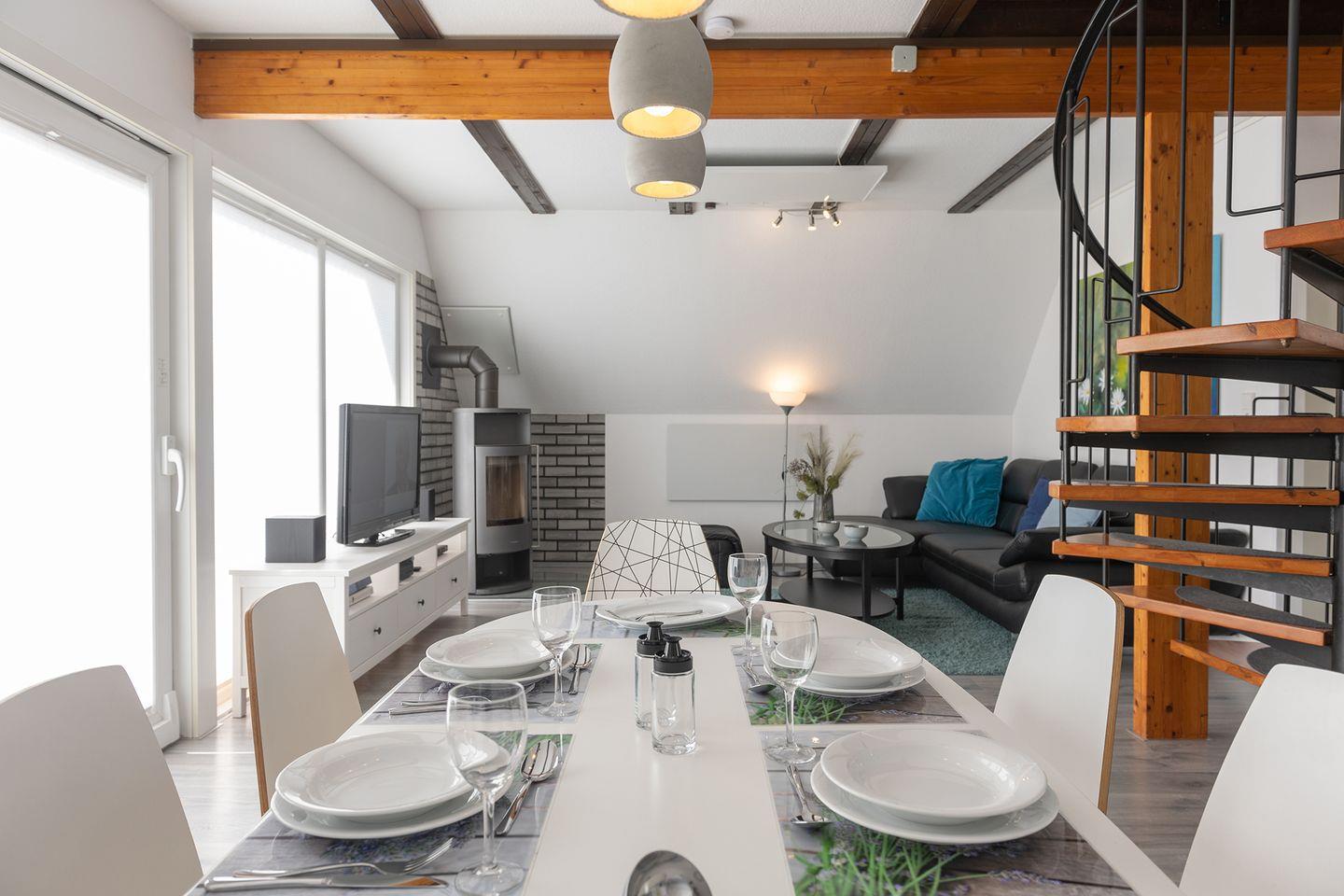 Im Erdgeschoss liegen ein Wohn-Essbereich mit moderner Küche, ein Schlafzimmer mit Doppelbett und ein Duschbad mit WC. Zwei weitere Schlafzimmer sowie ein zusätzliches WC befinden sich im Obergeschoss.