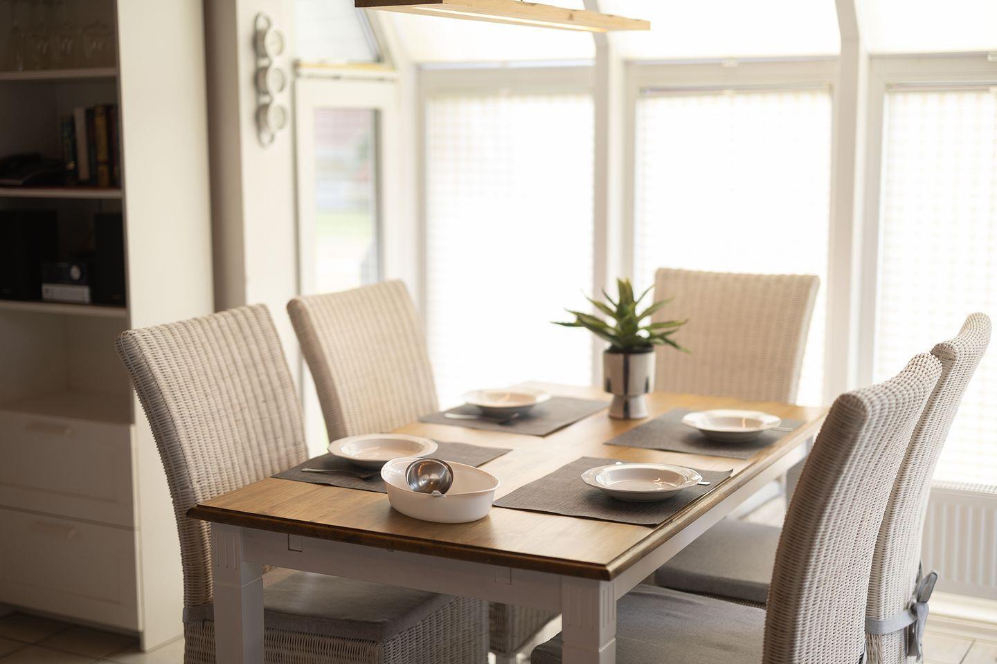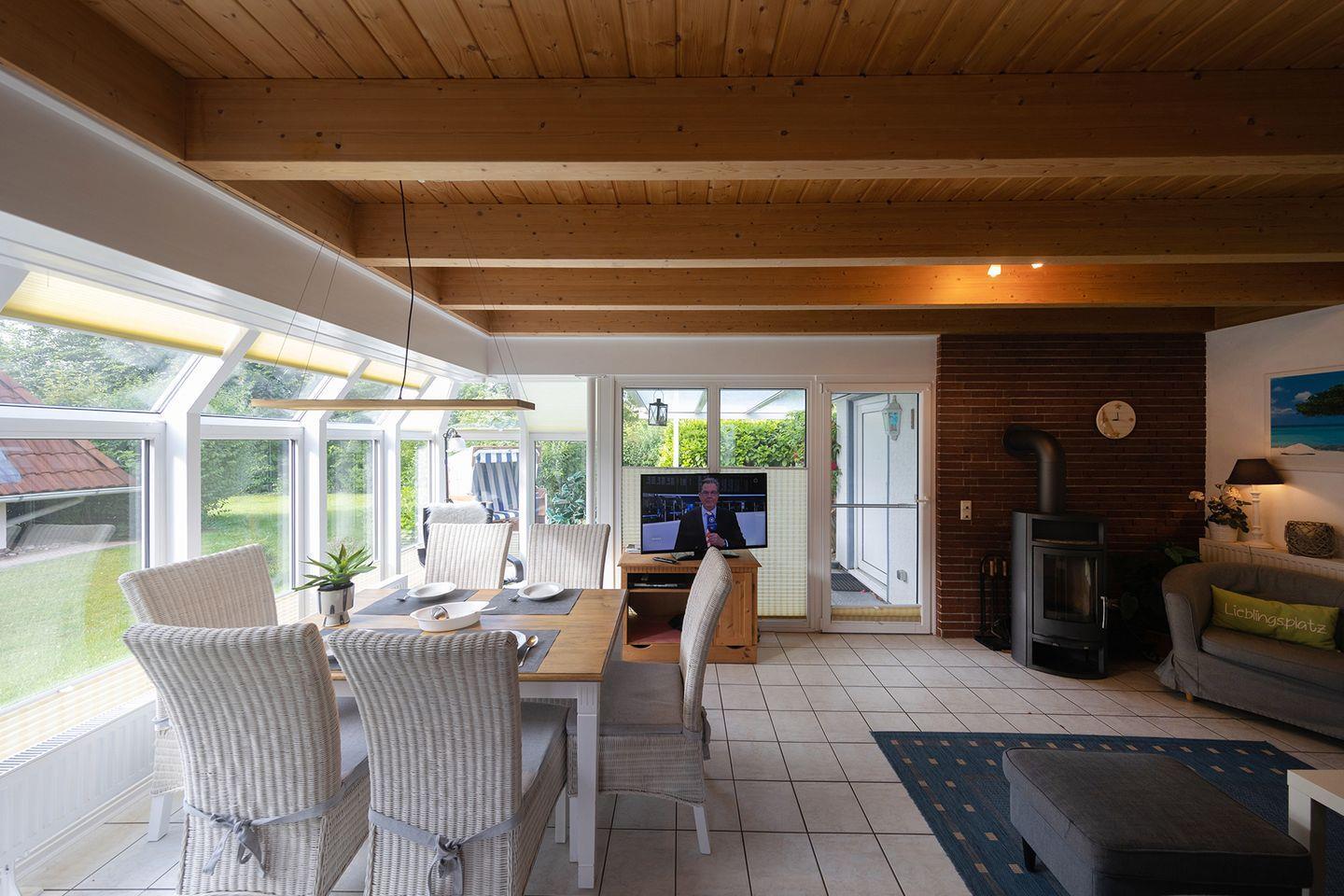 Das Ferienhaus „Ellersiek“ in Dorum-Neufeld bietet auf 64?m² Raum für sechs Personen, aufgeteilt in zwei Schlafzimmer, ein Wohn-Esszimmer mit Kaminofen, ein Bad mit Wanne und Dusche sowie einen sonnigen Wintergarten mit Blick ins Grüne. Die Küche ist offen und komplett ausgestattet: Ceranfeld, Spülmaschine, Mikrowelle, Kühlschrank mit Gefrierfach, Eierkocher und mehr stehen bereit.