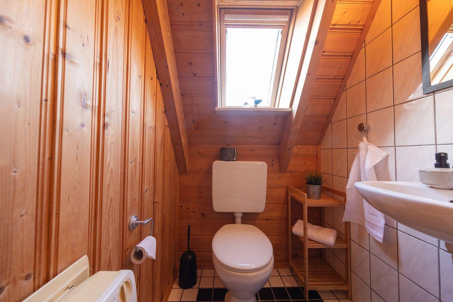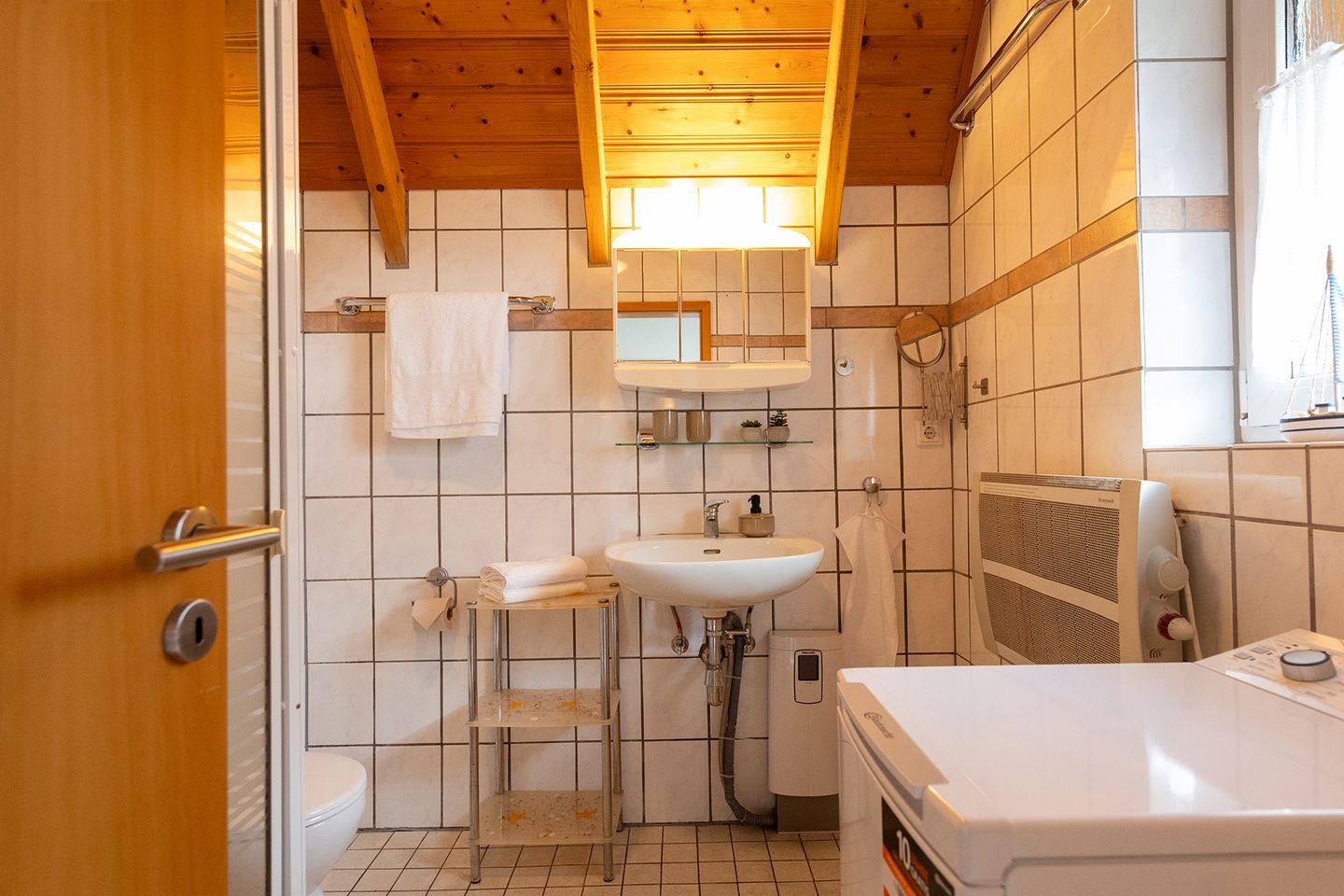mit Dusche ist ebenso wie der Boden gefliest und damit praktisch, wenn Sandspuren mitkommen. Waschmaschine und Trockner stehen bereit.