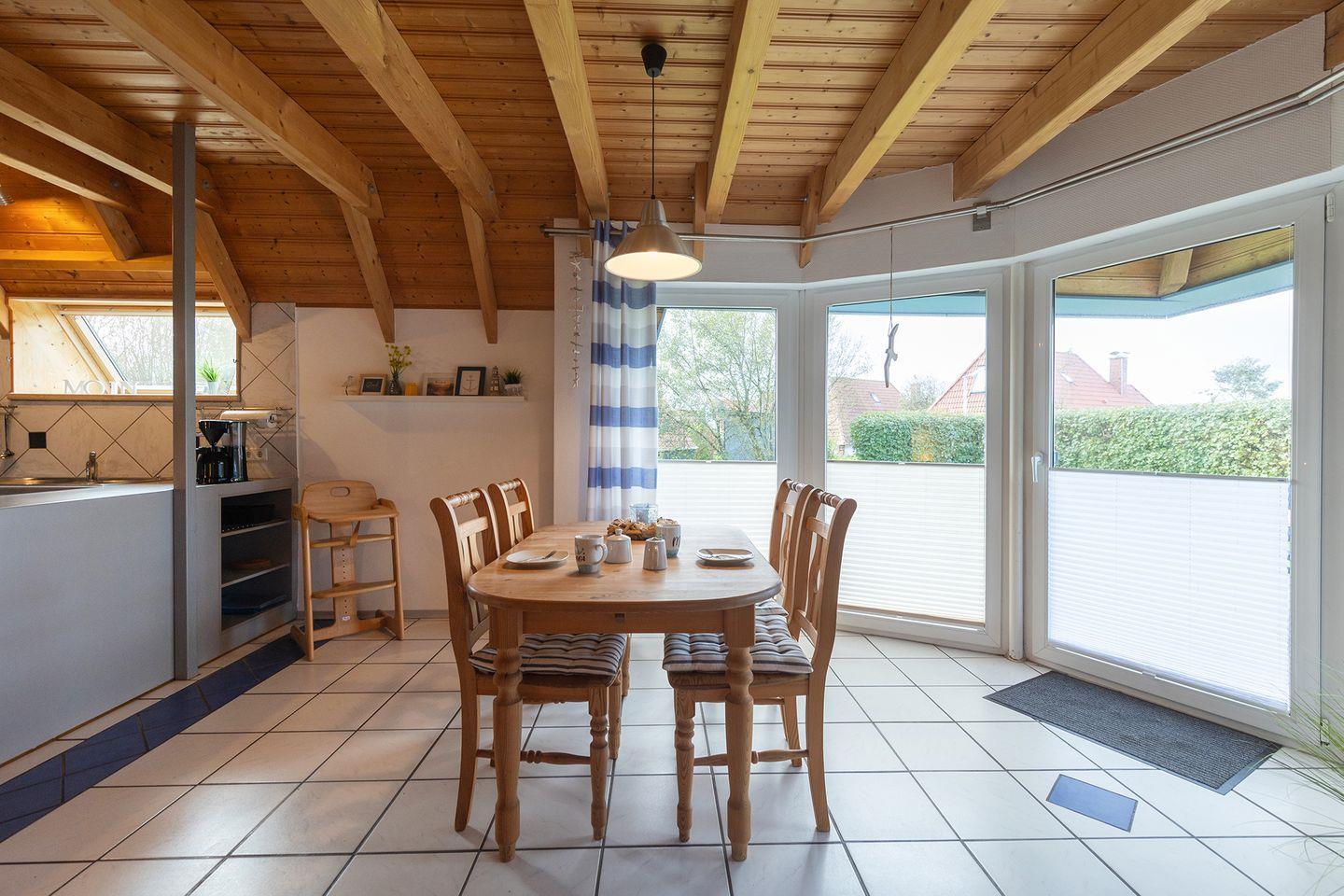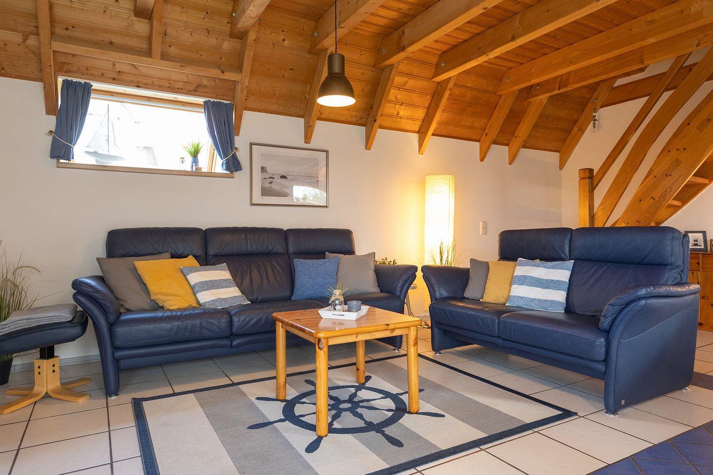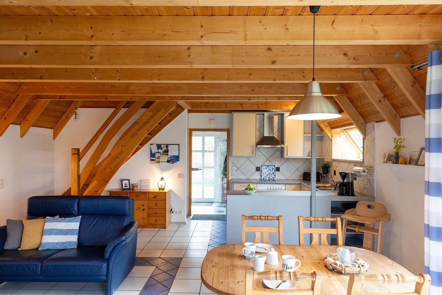 Drinnen erwartet dich eine helle, liebevoll eingerichtete Unterkunft mit 68?m² Wohnfläche auf zwei Ebenen. Im Erdgeschoss liegt der Wohn- und Essbereich mit offener Küche. Dort sind zwei Sofas, ein großer Tisch und viel Raum für gemeinsame Zeit. Die Küche ist komplett ausgestattet, Spülmaschine inklusive. Das Bad
