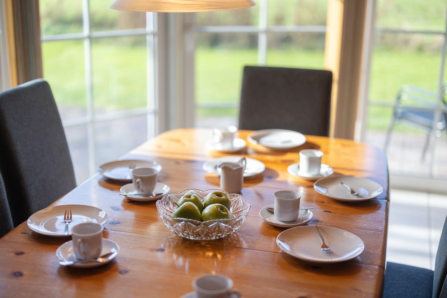 Im Garten wartet eine möblierte Terrasse mit freiem Blick über Wiesen und Felder – hier kann man essen, spielen, sitzen und die Ruhe genießen.