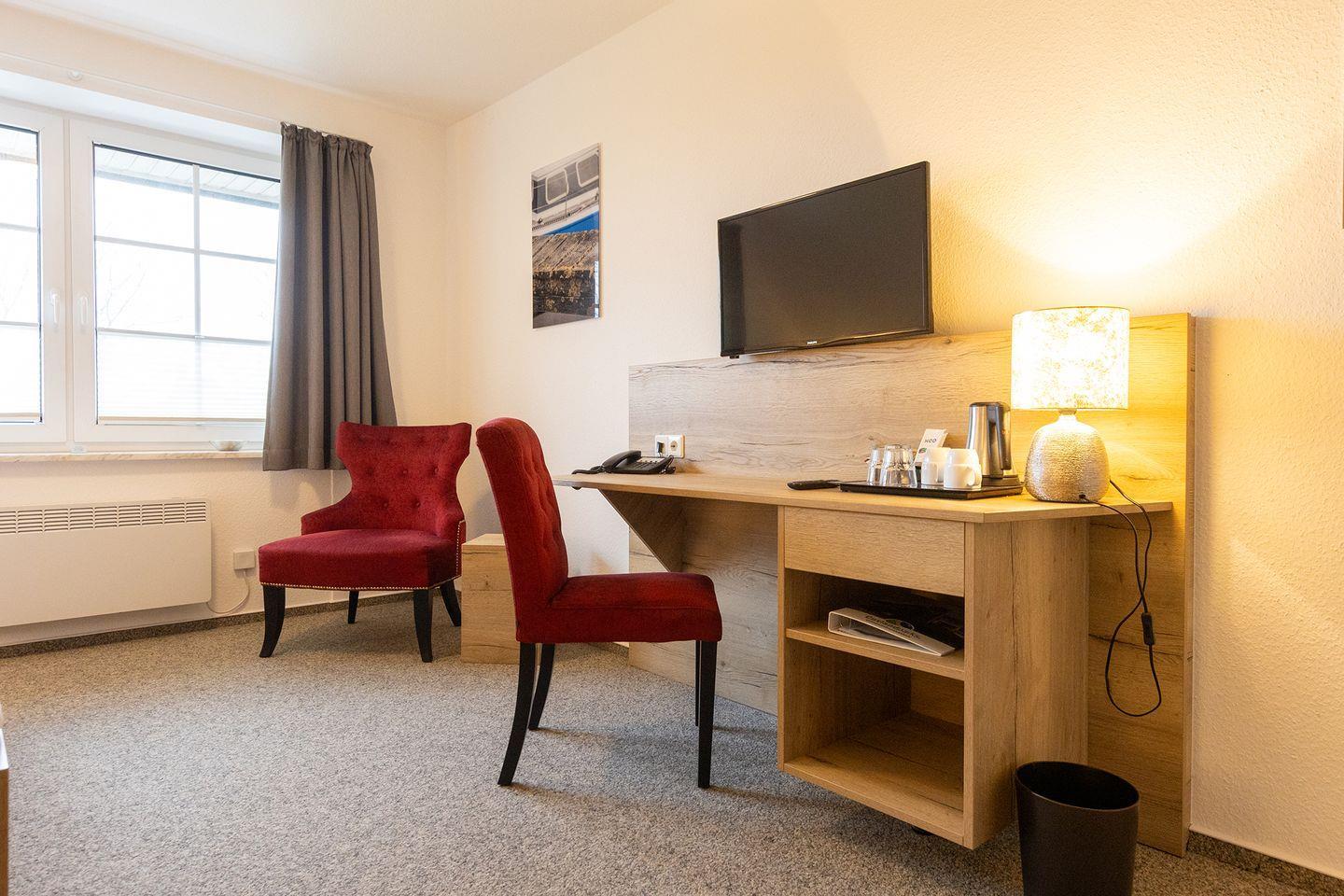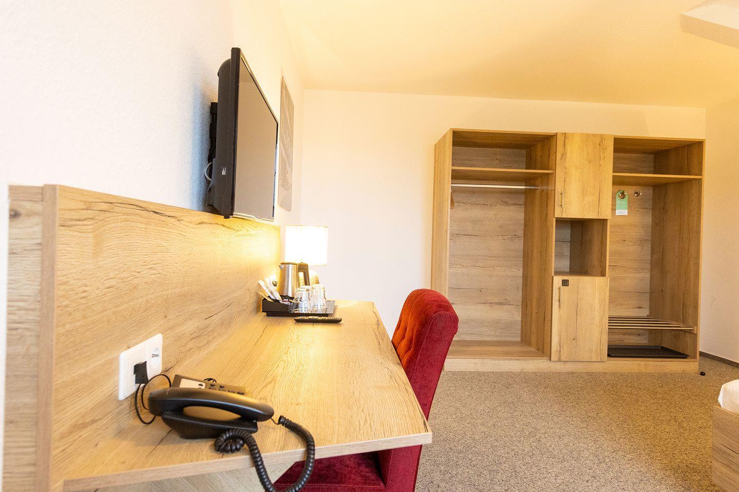 Doppelzimmer 123. Helles Interieur und Gartenblick.