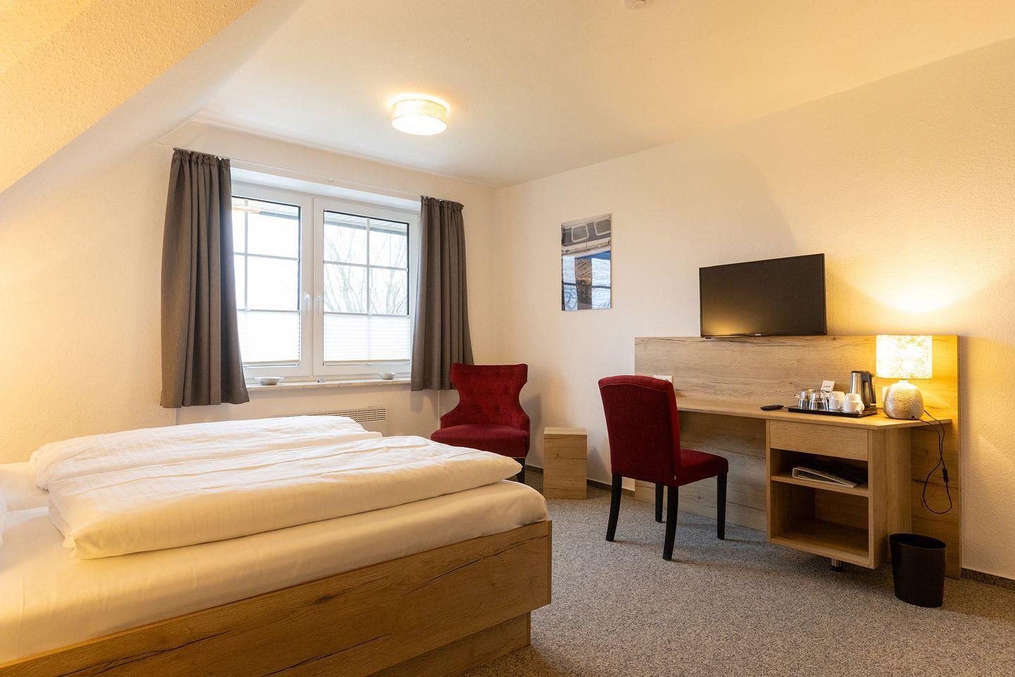 Gemütliches Doppelzimmer mit Gartenblick nahe Strand und Hafen an der Nordseeküste.