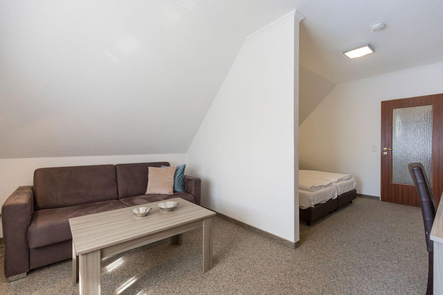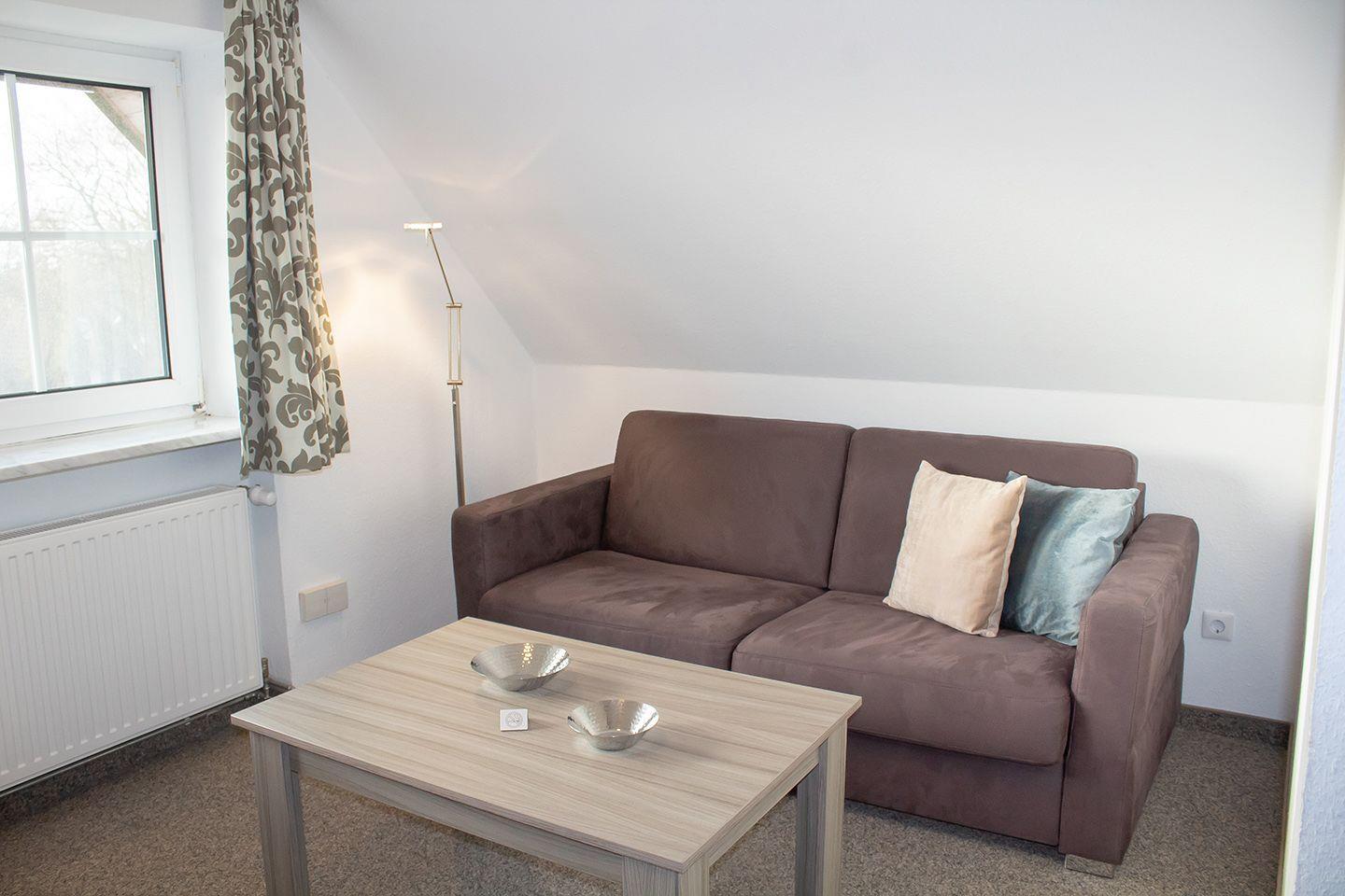 Modernes Studio in Dorum-Neufeld nahe Strand und Kutterhafen mit gemütlichem Sofa und Gartenbereich.