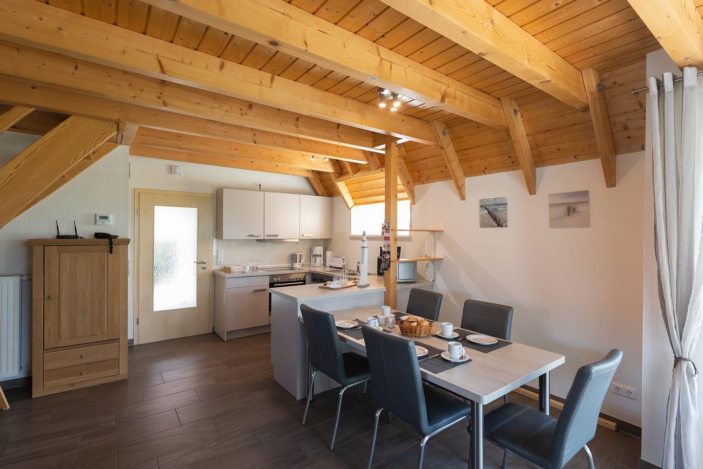 Am grünen Rand des Ferienparks gelegen, bietet dieses Ferienhaus für Familien an der Nordsee viel Ruhe und Komfort - und ist doch nur einen kurzen Spaziergang (1km) vom Strand, dem Watt’n Bad und dem kleinen Kutterhafen entfernt. Auf 85?m² Wohnfläche finden bis zu sechs Personen Platz: Im Erdgeschoss ein offener Wohn-Essbereich mit Kaminofen, eine voll ausgestattete Küche, ein Schlafzimmer mit zwei Einzelbetten und ein Duschbad mit Waschmaschine. Im Obergeschoss liegen das Elternschlafzimmer mit Doppelbett, ein weiteres Zimmer mit getrennten Betten sowie ein zusätzliches WC.