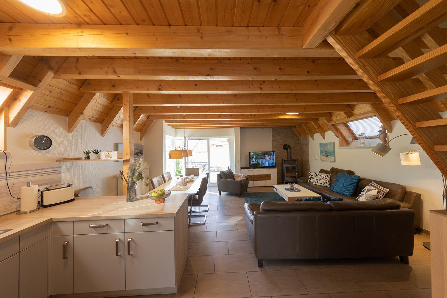 Mit 85?m² Wohnfläche auf zwei Etagen ist genug Platz für bis zu sechs Personen. Drei Schlafzimmer, zwei WCs, voll ausgestattete Küche mit Geschirrspüler, Kaminofen, Waschmaschine und Trockner. Für Familien gibt’s Kinderbett, Hochstuhl und eine geschützte Terrasse mit Grillmöglichkeit.