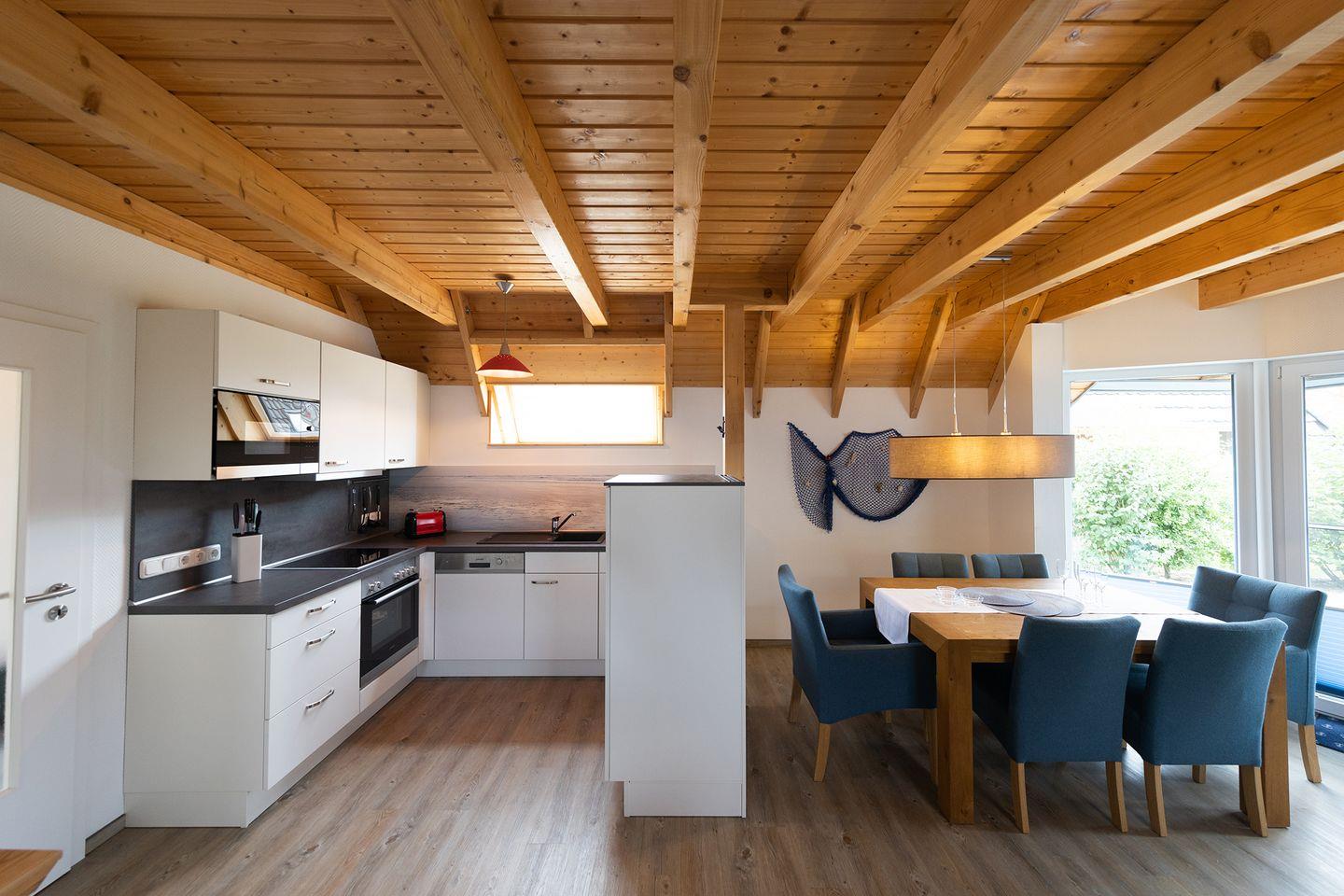 Bei eurer Ankunft liegt das Ferienhaus ruhig im Marschland, nur einen kurzen Fußweg vom Deich entfernt. Auf zwei Etagen verteilen sich vier Zimmer: Im Erdgeschoss verbindet der offene Wohn-Essbereich mit Kaminofen und komplett ausgestatteter Küche alles, was ihr für gemeinsame Stunden braucht. Dazu kommen ein Schlafzimmer mit zwei Einzelbetten und ein helles Duschbad mit Waschmaschine. Für die Kleinsten sind Kinderreisebett und Hochstuhl.