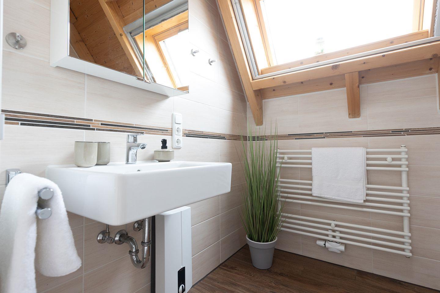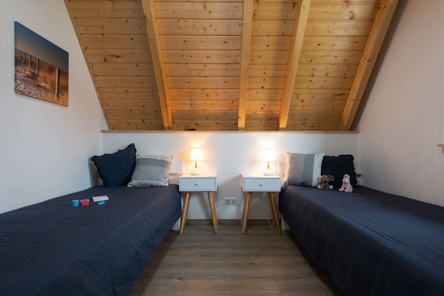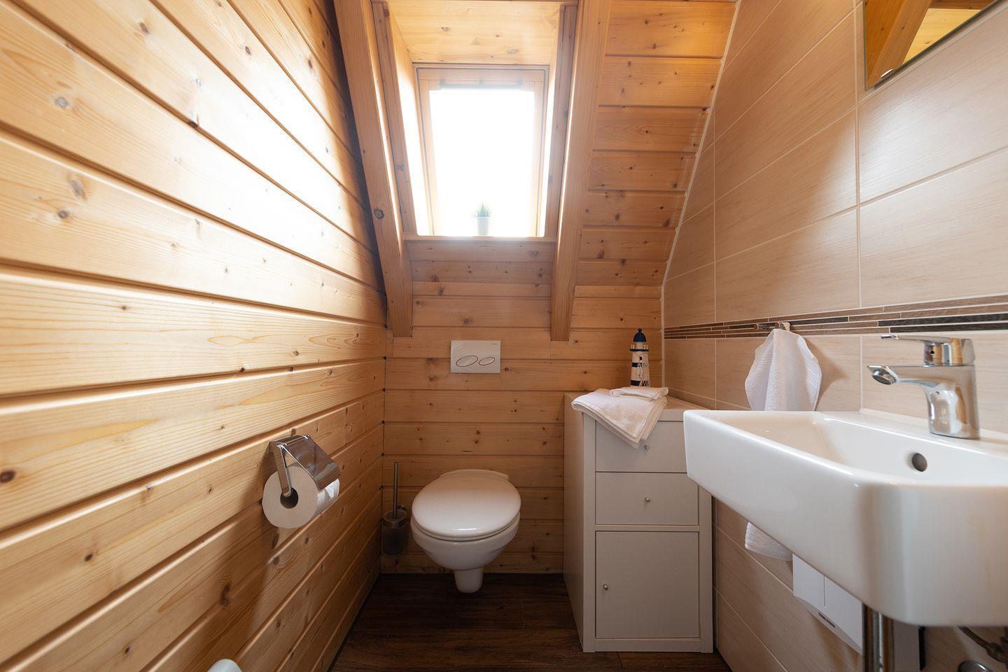 Oben befinden sich das Elternschlafzimmer mit Doppelbett, ein weiteres Kinderzimmer mit getrennten Betten sowie ein zusätzliches WC. Fliesen und Laminat sorgen für ein pflegeleichtes Zuhause auf Zeit, die zentrale Gastherme für angenehme Wärme. Kinderbett und Hochstuhl sind vorhanden.