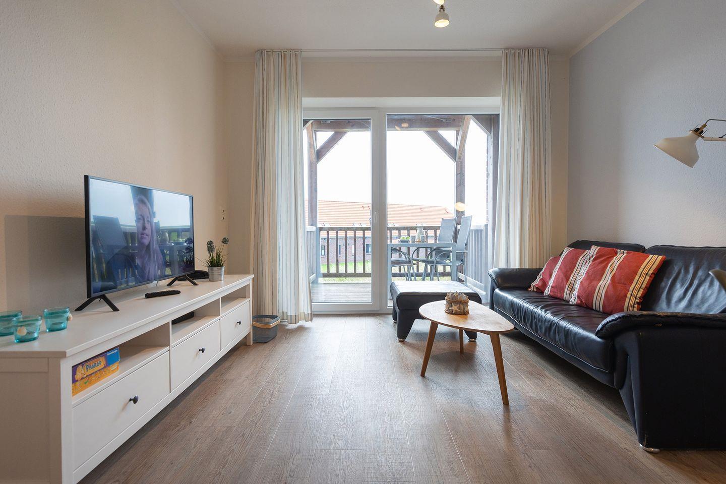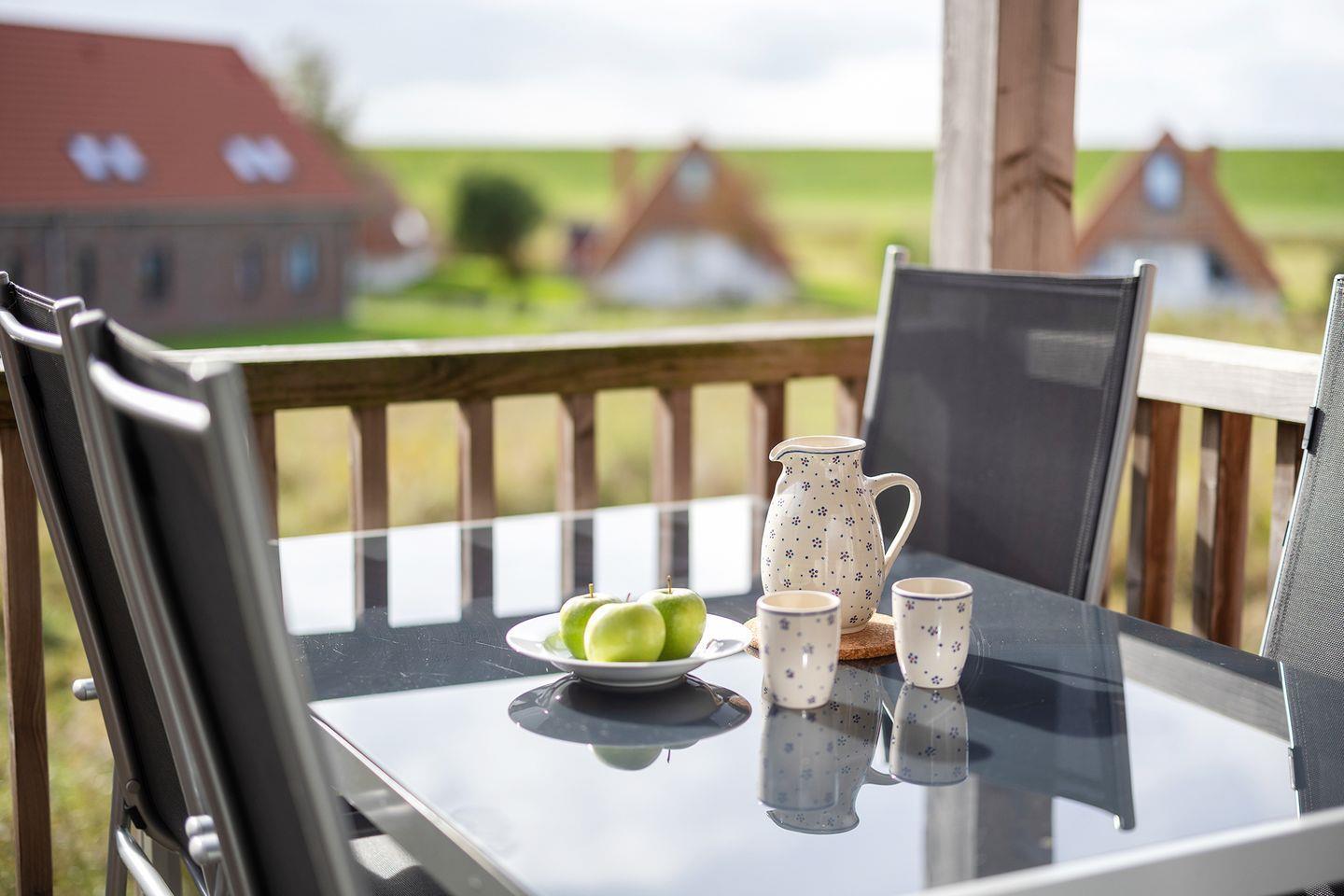 Komfortable Ferienwohnung Deichkieker mit Balkon, nahe Strand und Kutterhafen an der Nordseeküste.
