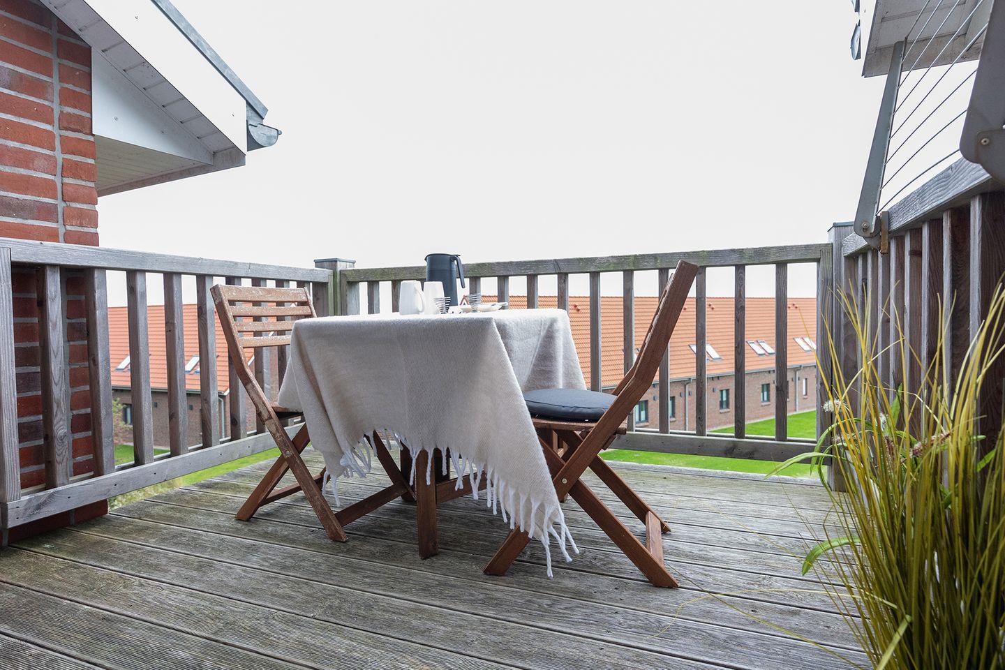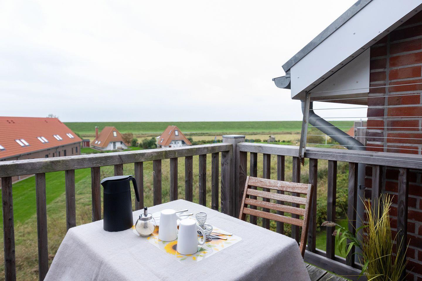 Vom Balkon aus schweift der Blick über die Landschaft, während Möwen über den Deich ziehen. Hier beginnt der Tag mit einer frischen Brise und endet vielleicht mit einem Sonnenuntergang über dem Wattenmeer.