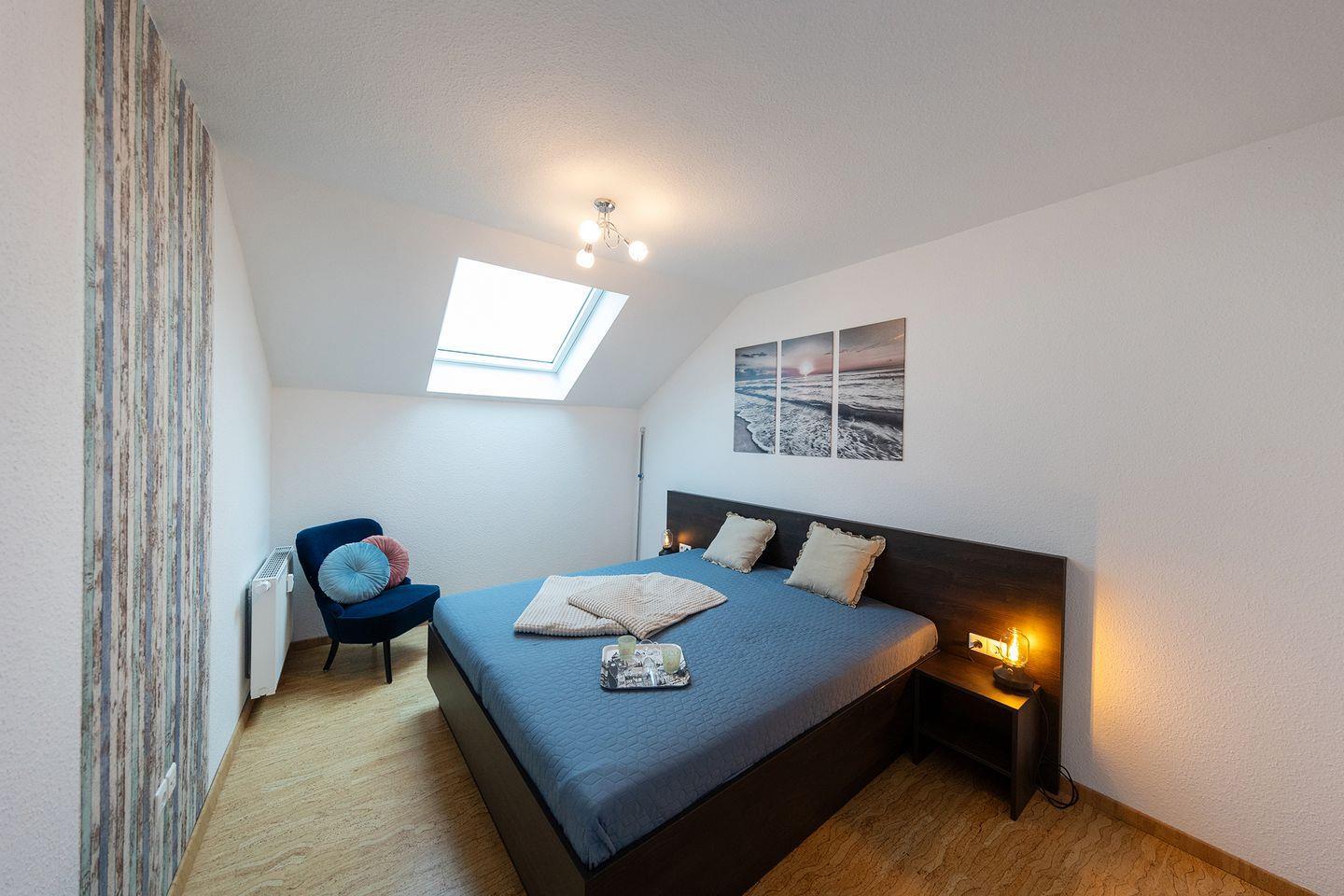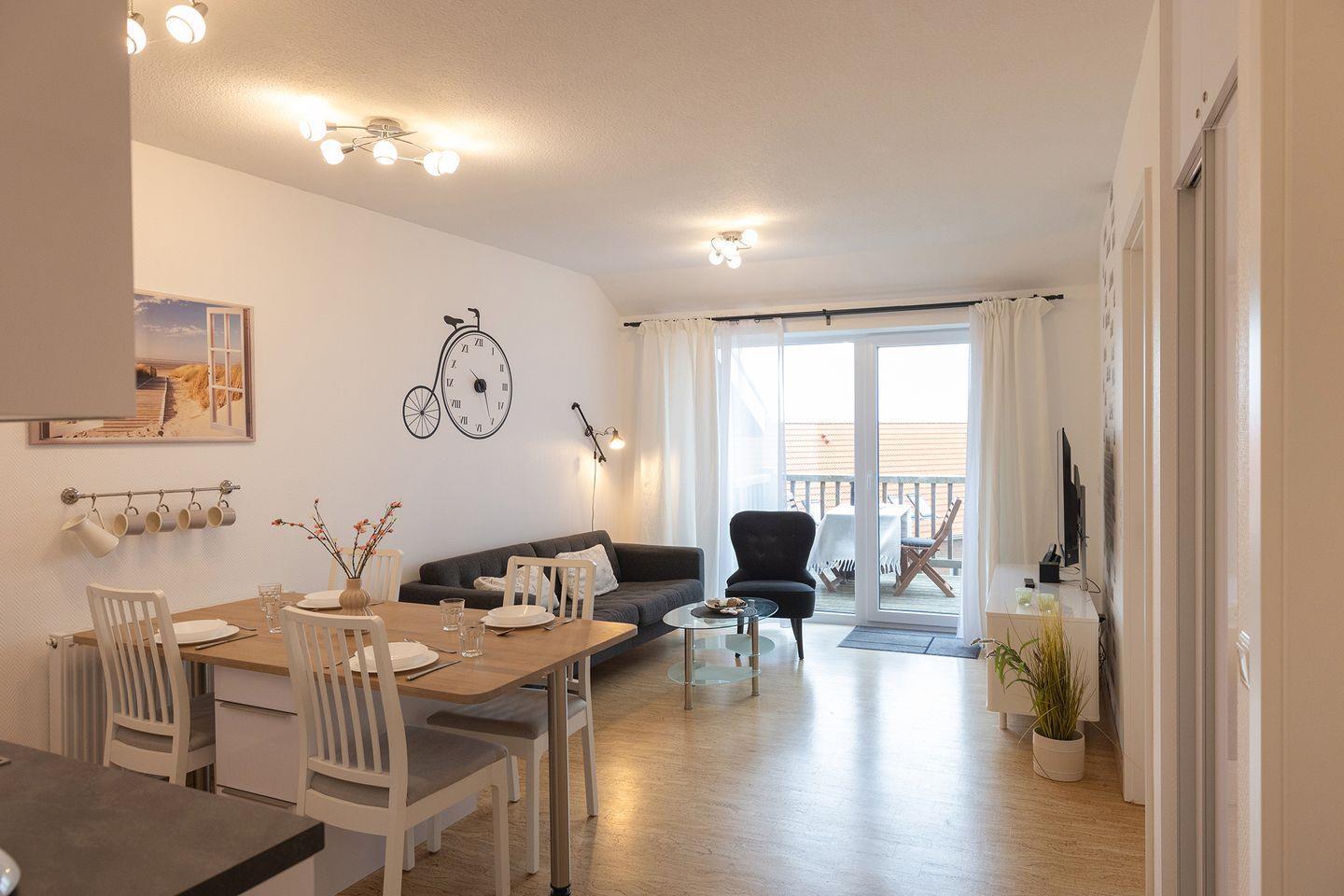 Hoch oben, mit freiem Blick bis zum Meer: Diese Dachgeschosswohnung im Wremer Bogen ist ein Rückzugsort für alle, die die Nordsee ganz nah erleben möchten – ruhig gelegen, direkt hinter dem Deich. Auf ca. 70?m² erwarten dich zwei Schlafzimmer - eines mit Doppelbett, eines mit zwei Einzelbetten - eine voll ausgestattete Küche im offenen Wohnbereich und ein großzügiges, modernes Duschbad. WLAN, ein Designfußboden, Kinderbett, Hochstuhl und ein kostenfreier Parkplatz runden die Ausstattung ab.