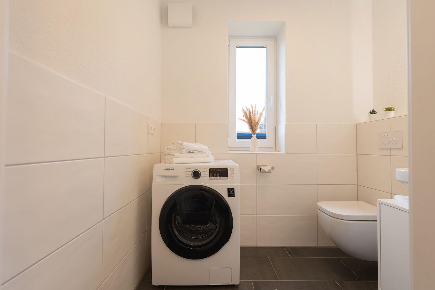 Vor dem großen Fenster lädt die Rasenfläche zum Spielen oder Dösen ein. Kinderbett, Hochstuhl und kostenfreier Parkplatz sind vorhanden.