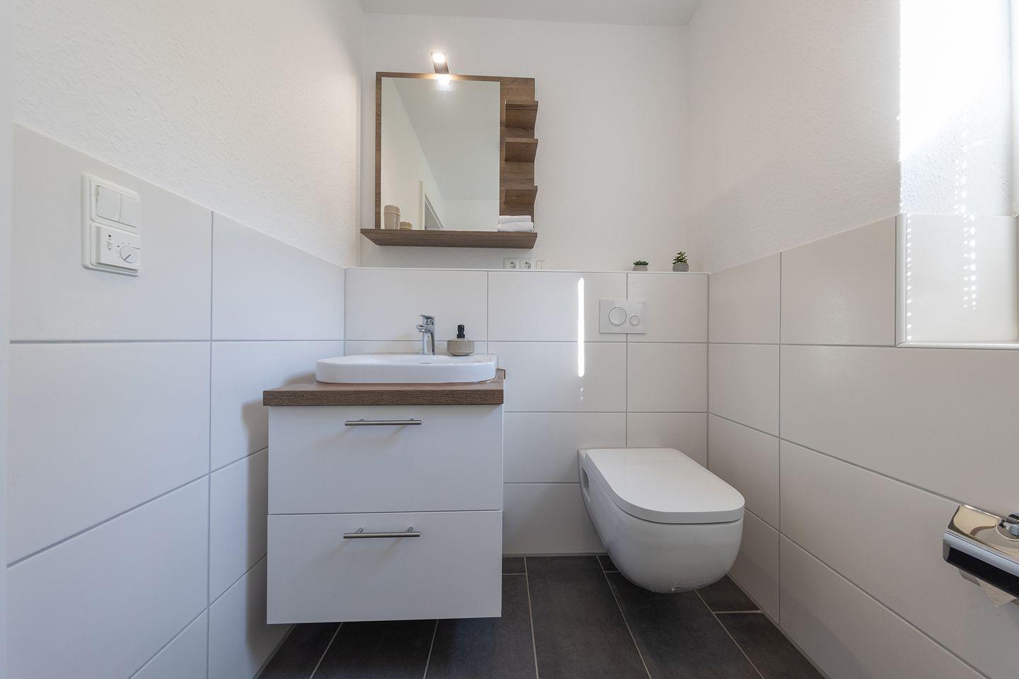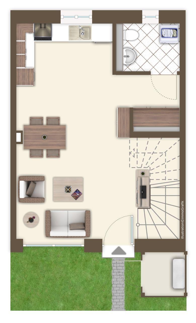 Im Erdgeschoss: ein heller Wohn-Essbereich mit gemütlicher Wohnlandschaft, offener Küche, Esstisch und Gäste-WC. Im Obergeschoss: drei Schlafzimmer – zwei mit Doppelbetten, eins mit zwei Einzelbetten – sowie ein Duschbad. Alle Schlafräume können verdunkelt werden und sind mit Laminat ausgelegt. Fußbodenheizung und automatische Be- und Entlüftung sorgen für ein angenehmes Raumklima.