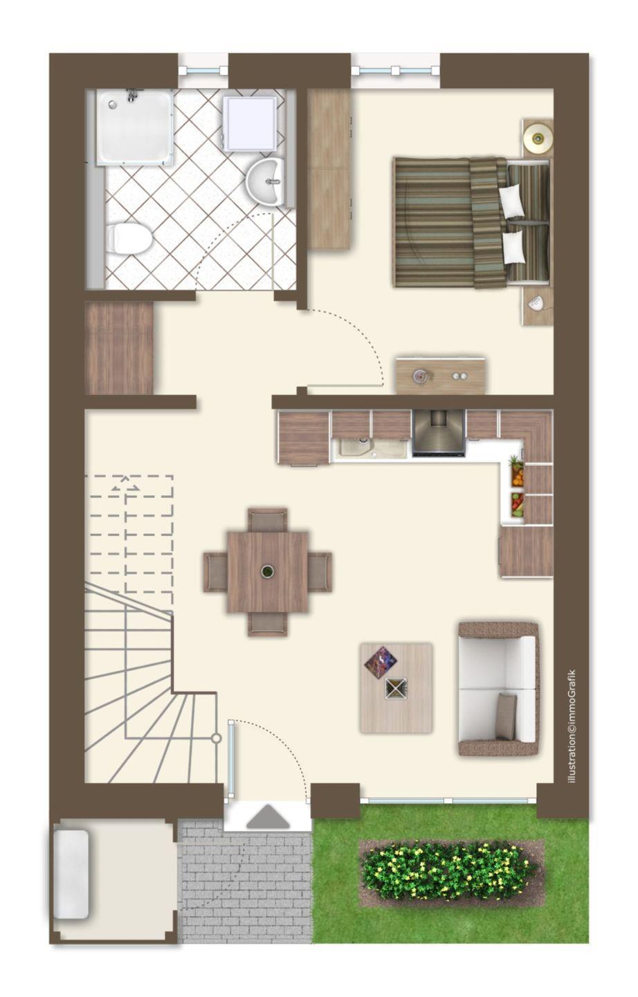 Im Erdgeschoss: ein heller Wohn-Essbereich mit gemütlicher Wohnlandschaft, offener Küche, Esstisch und Gäste-WC, sowie ein Schlafzimmer mit Doppelbett. Im Obergeschoss: zwei Schlafzimmer – mit Doppelbett, sowie ein Duschbad. Alle Schlafräume lassen sich verdunkeln und sind mit Laminat ausgelegt. Fußbodenheizung und automatische Be- und Entlüftung sorgen für ein angenehmes Raumklima.