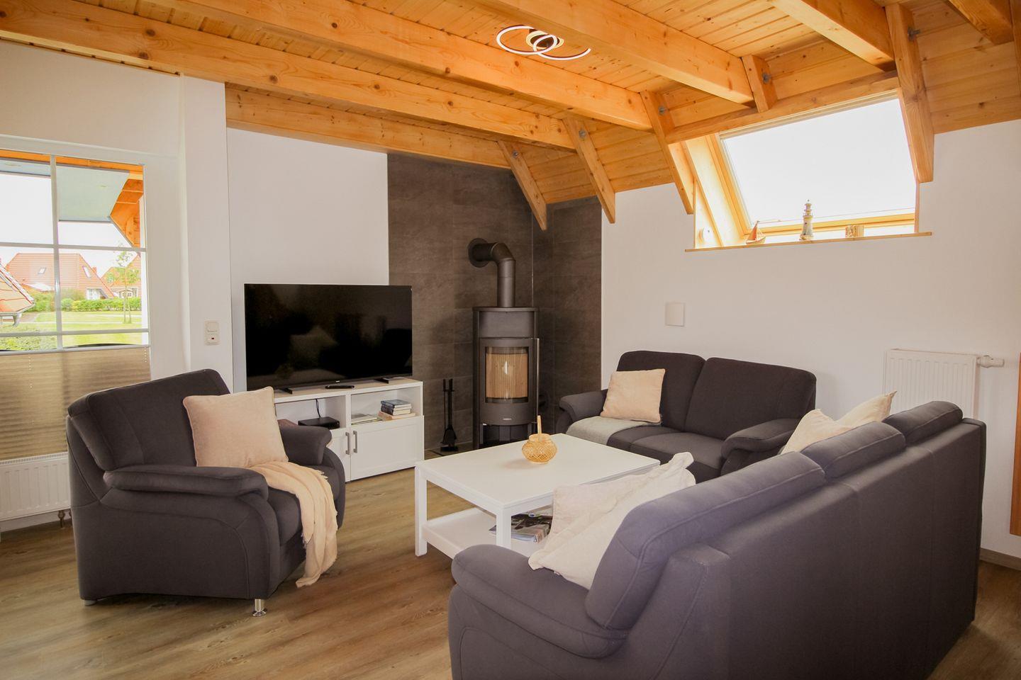 Wo sich das Marschland langsam zur Küste hin öffnet, liegt dieses Ferienhaus in Dorum-Neufeld – ruhig, grün und mit Platz für bis zu sechs Personen. Der Wohnbereich mit pflegeleichtem Vinylboden und Kaminofen lädt zum Ankommen ein. Für den Komfort steht eine eigene Waschmaschine zur Verfügung. Draußen: eine möblierte Terrasse, ein Garten zum Spielen, Raum für gemeinsame Zeit.
