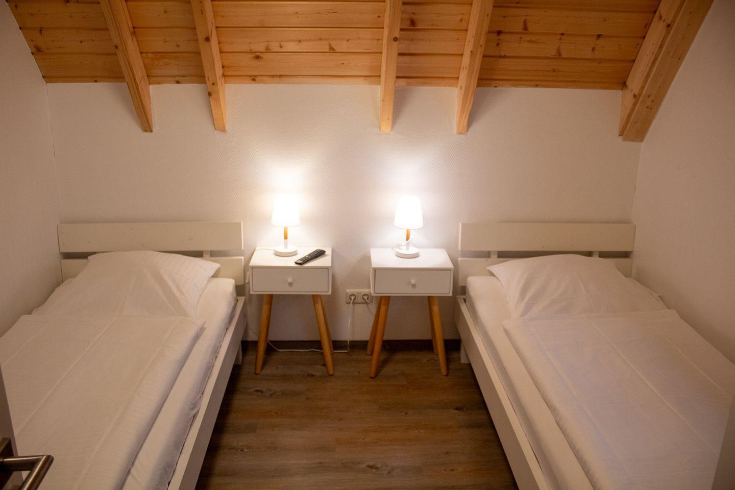 Oben findest du das Elternschlafzimmer mit komfortablem Doppelbett sowie ein weiteres Zimmer mit getrennten Betten. Alle Räume sind praktisch und gepflegt eingerichtet, Fliegengitter sorgen für frische Luft ohne Mücken. Hochstuhl und Kinderbett stehen bereit, damit auch die Kleinsten unbeschwert toben können. Eine Ladestation für E-Autos an der Rezeption sorgt für Komfort.