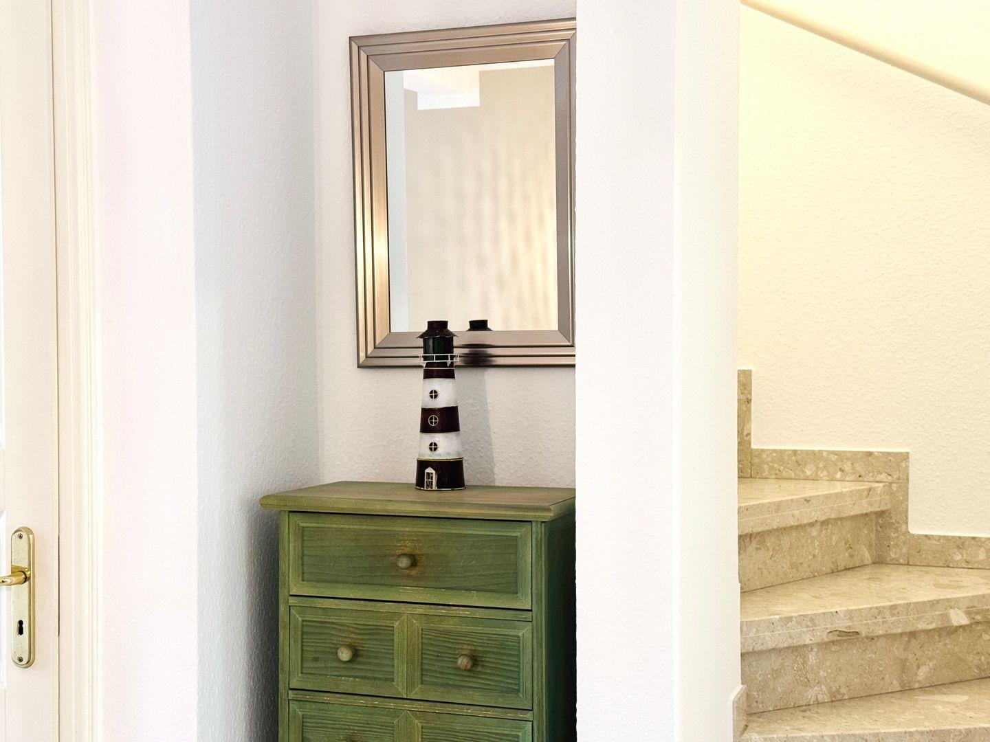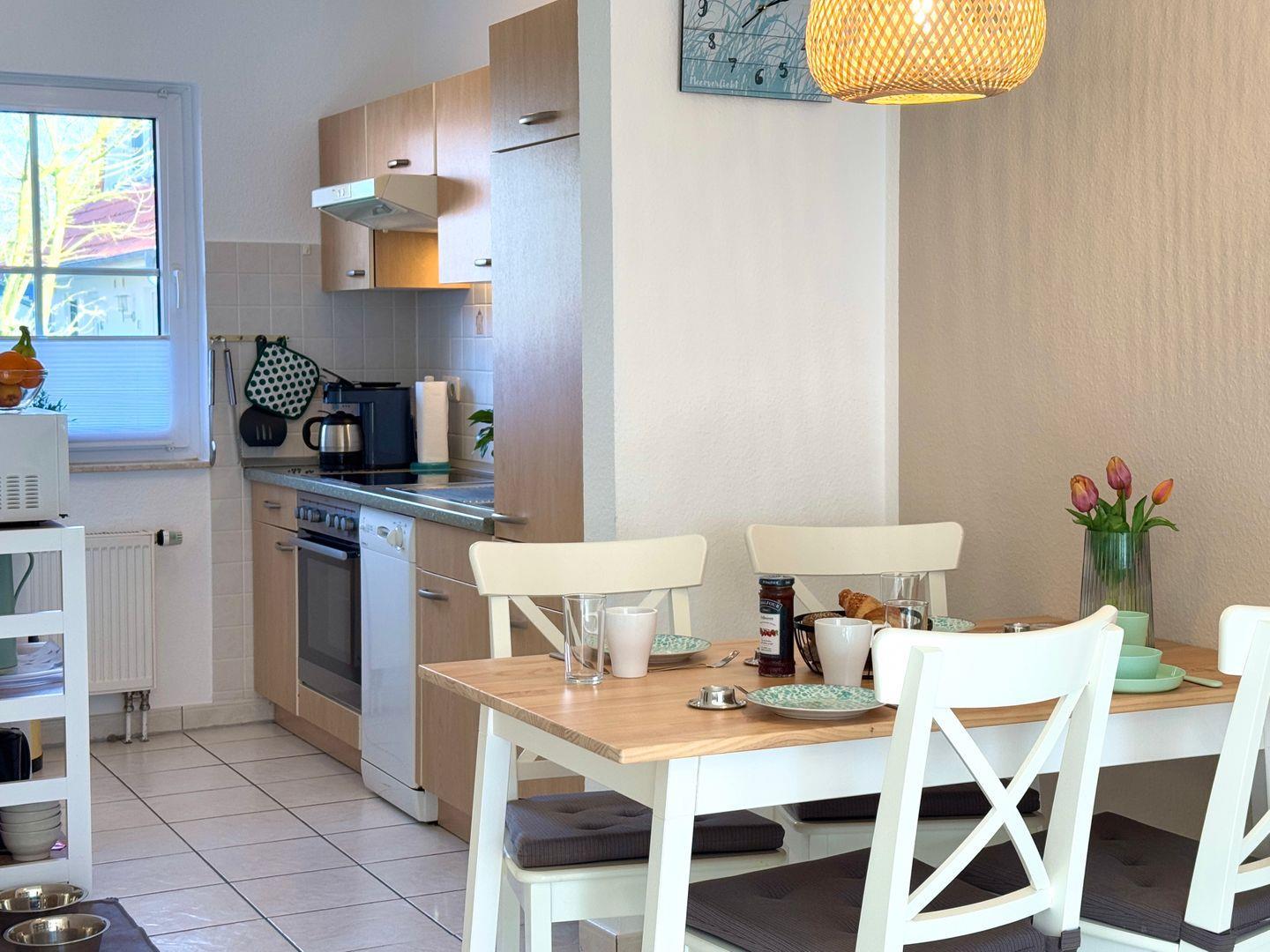 Im Erdgeschoss findest du eine voll ausgestattete offene Küche mit Geschirrspüler und Waschmaschine, einen gemütlichen Wohnbereich mit Sofa und TV und ein Gäste-WC. Von hier aus gelangst du direkt auf die Terrasse, die zum Entspannen und grillen einlädt.