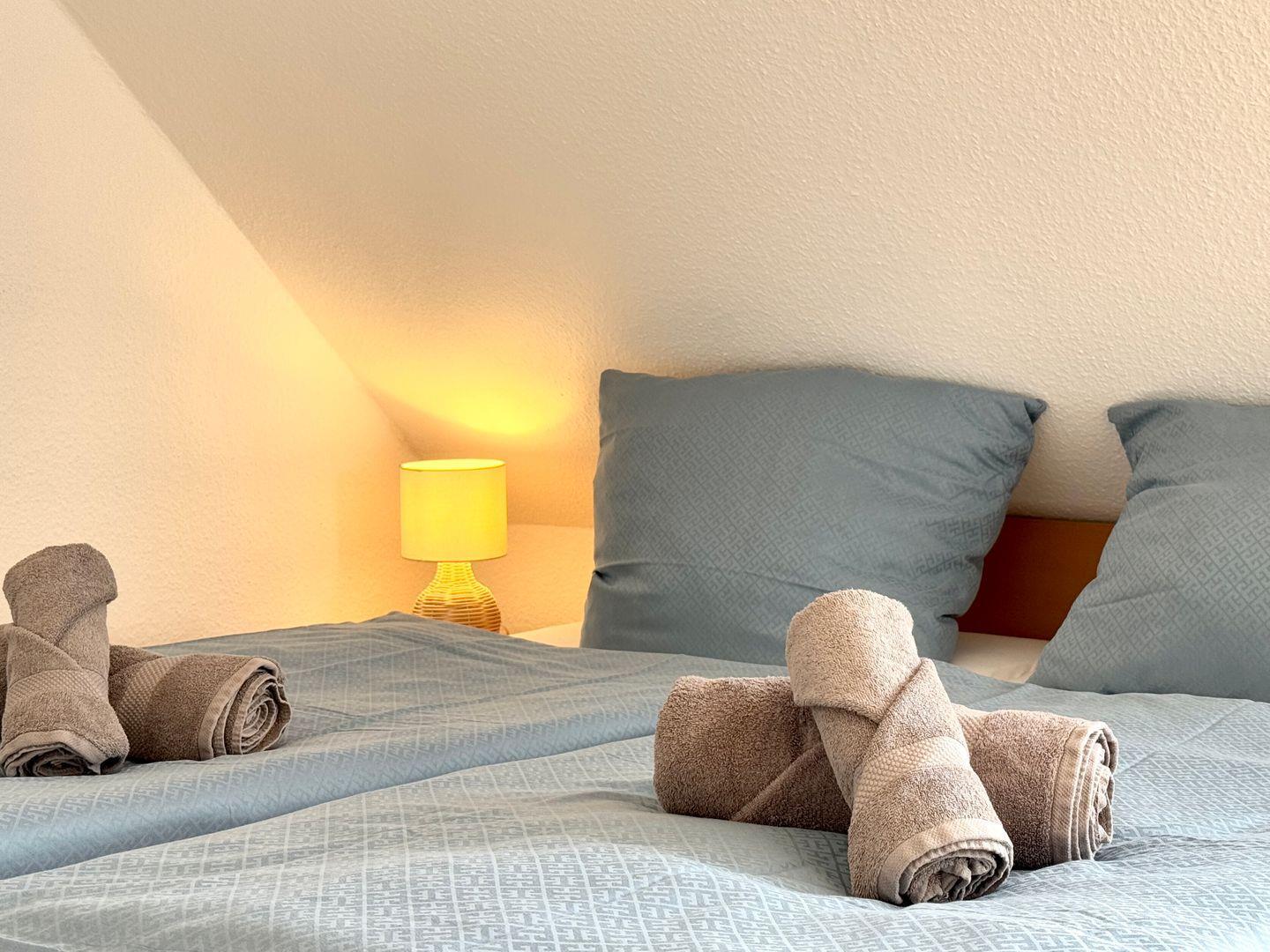Im Obergeschoss erwarten dich zwei komfortable Schlafzimmer: Eines mit einem großzügigen Doppelbett (1,80 x 2,00 m) und einem praktischen Schreibtisch. Das zweite Zimmer verfügt über zwei Einzelbetten (je 0,90 x 2,00 m) und einem TV – perfekt für die ganze Familie. Beide Räume sind mit Außenrollläden ausgestattet. Das moderne Badezimmer ist mit Fußbodenheizung, Handtuchheizung und Dusche ausgestattet.