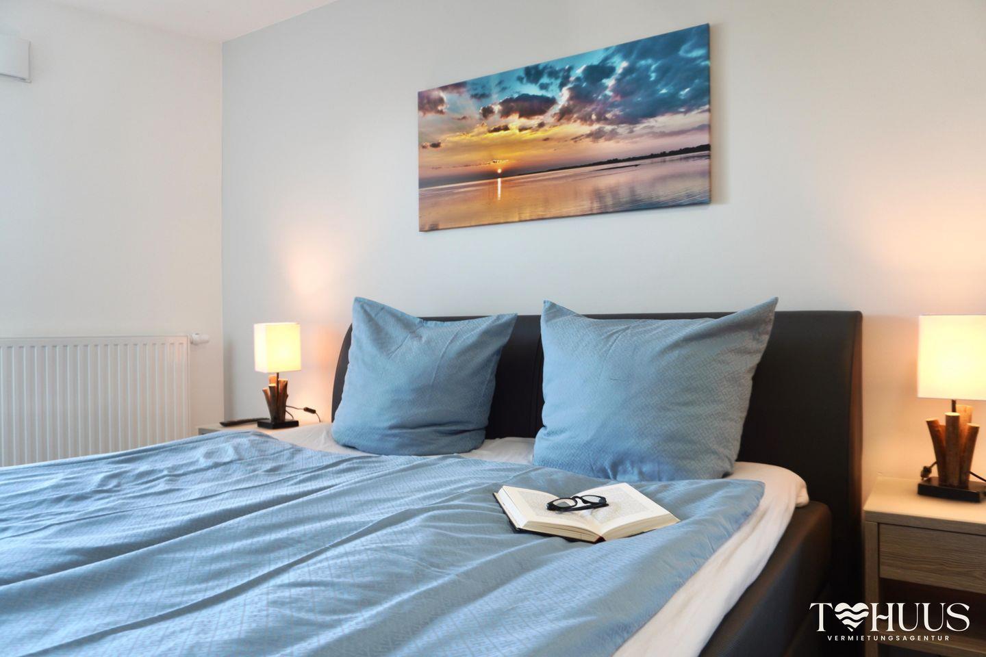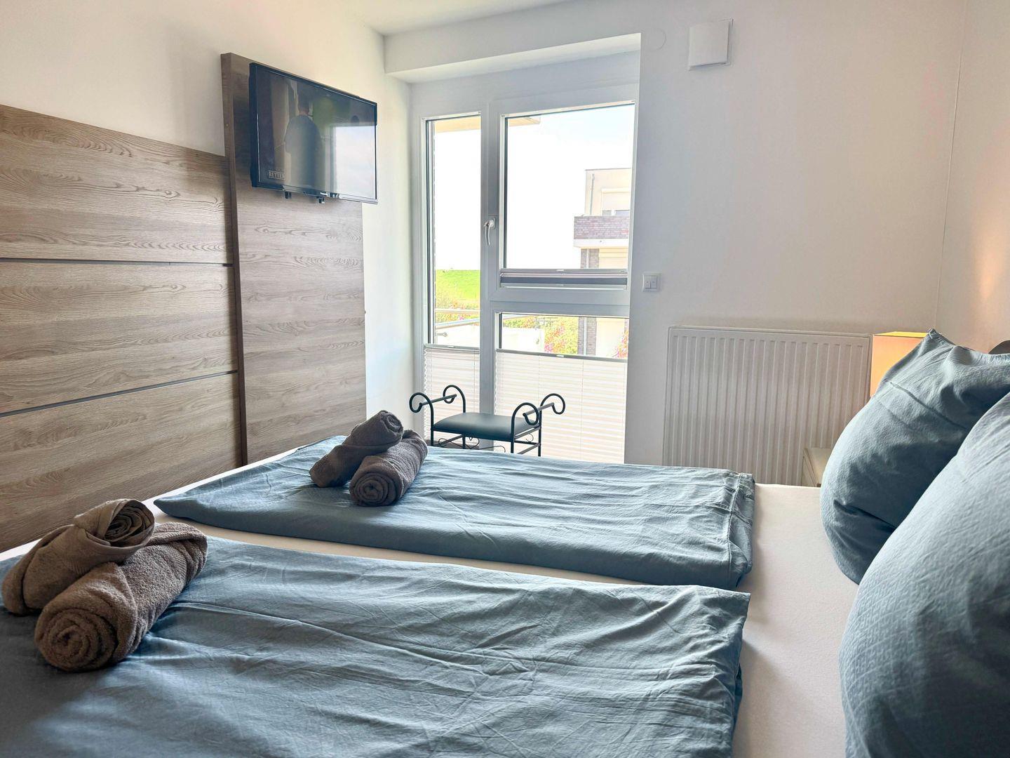 Die Wohnung verfügt über zwei Schlafzimmer: ein großes mit Boxspringbett (1,80 x 2,00 m)., Flach-TV und Einbaukleiderschrank sowie ein weiteres Schlafzimmer mit hochwertiger Schlafcouch (1,60 x 2,00 m). Beide Schlafzimmer sind mit Außenrollläden zur Verdunklung ausgestattet.