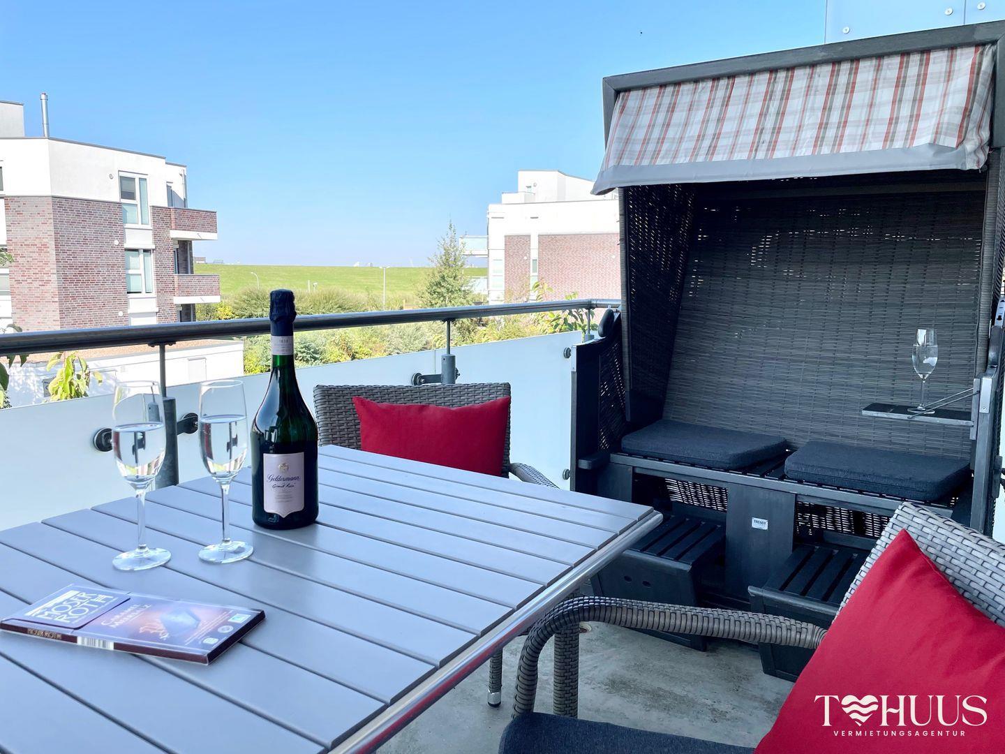 Genieße entspannte Stunden auf dem Balkon, der direkt vom Wohnraum zugänglich und im Sommer mit Gartenmöbeln ausgestattet ist. Dank der Südwest-Ausrichtung kannst du die Sonne bis in die Abendstunden genießen.
