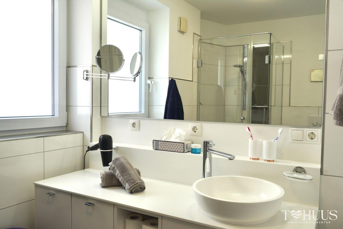 Das moderne Badezimmer bietet dir eine bodengleiche Dusche, Waschtisch, Föhn und Tageslicht.