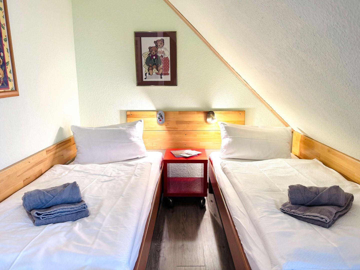 Im Obergeschoss warten zwei Schlafzimmer auf dich: ein Zimmer mit einem Doppelbett (Matratze je 0,90 m x 2,00 m) und ein weiteres mit zwei Einzelbetten (Matratze je 0,80 m x 1,90 m). Das Badezimmer bietet zusätzlichen Komfort mit Fußbodenheizung, Handtuchheizung und einer Dusche.