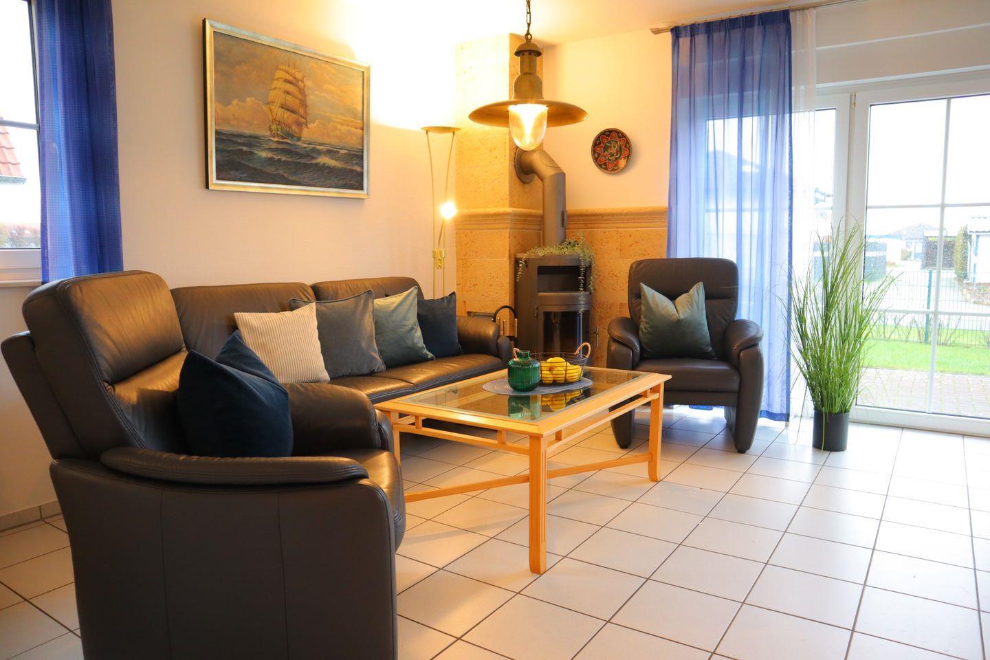 Der Wohnbereich ist mit einer einladenden Couchgarnitur sowie Sesseln, einem Smart-TV und einem Kaminofen ausgestattet, der gerade an den kühleren Tagen für besondere Behaglichkeit sorgt. Die Küche lässt mit ihrer umfangreichen Ausstattung keine Wünsche offen.
