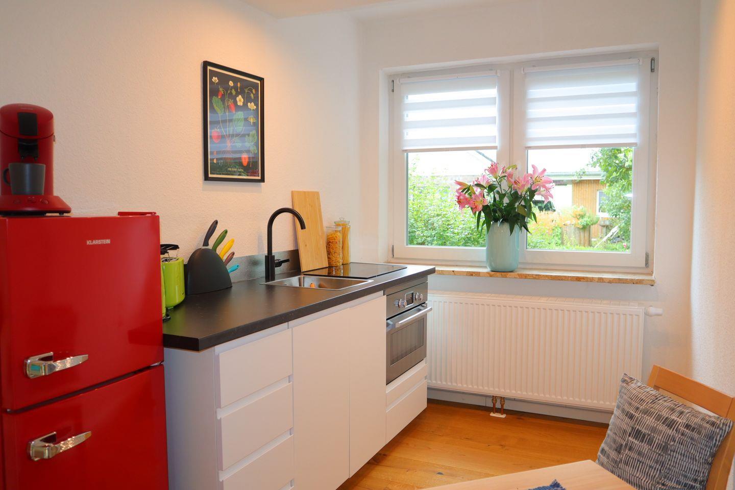 Der gemütliche Schlafbereich mit großem Kleiderschrank und komfortablem Doppelbett lädt zu erholsamen Nächten ein. Im Wohnbereich sorgen eine gemütliche Sitzecke und ein großer TV für entspannte Abende. Die voll ausgestattete Küche bietet alles, was Sie für Ihre Urlaubsverpflegung benötigen – vom ersten Kaffee am Morgen bis zum ausgiebigen Abendessen nach einem Tag an der frischen Seeluft.
