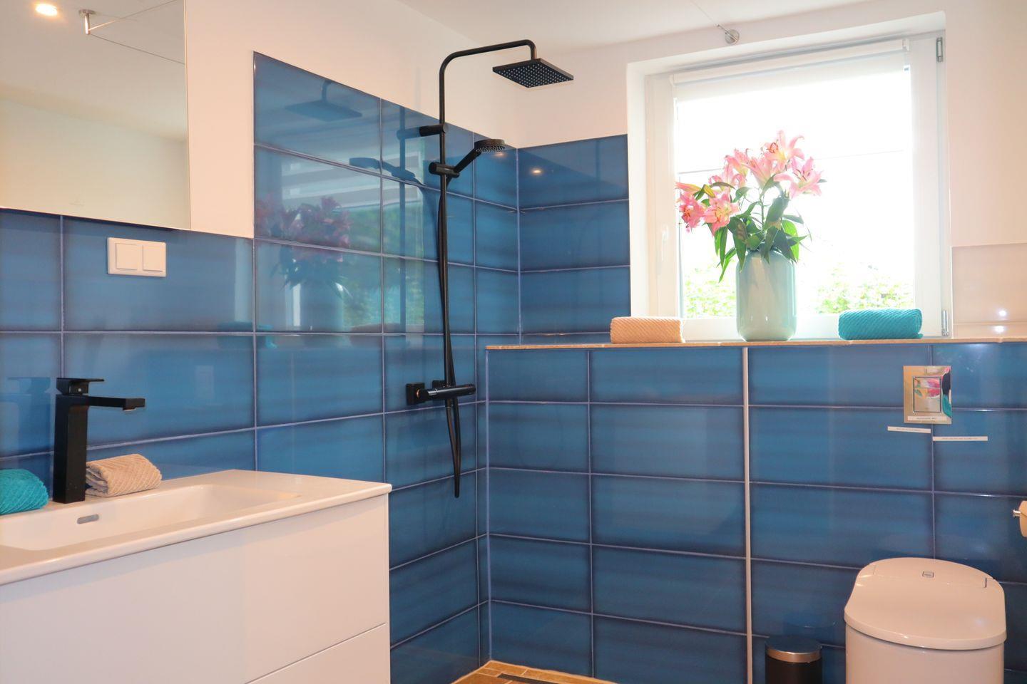 Das Badezimmer ist in edler Natursteinoptik gefliest und mit einer komfortablen Dusche ausgestattet.