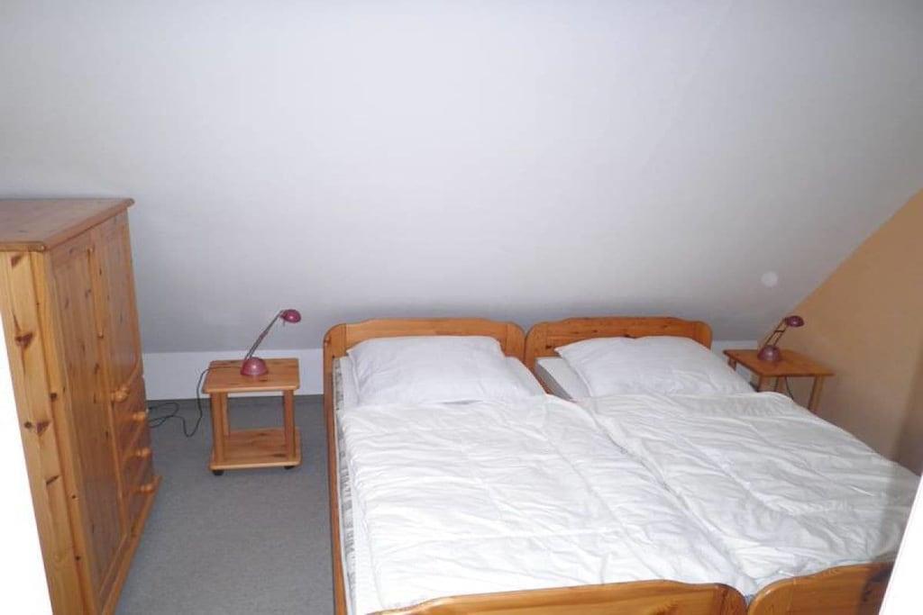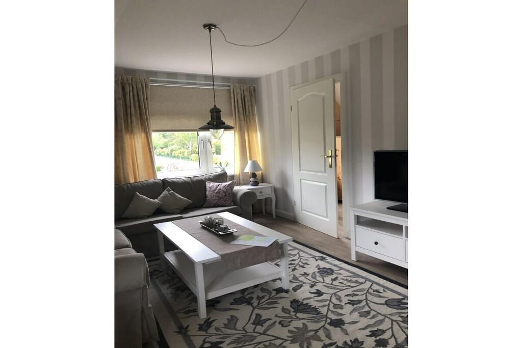 Die Ferienwohnung liegt in einem ruhig gelegenen Haus und bietet Platz für bis zu 5 Personen. Vom großen Wohnzimmer mit gemütlicher Sitzecke, Flachbildfernseher und Radio haben Sie einen Blick in die benachbarten Gärten und den Wald. In der Küche finden Sie alle Küchengeräte, die Sie zum Kochen benötigen. Die Mahlzeiten können Sie am Esstisch zur sich nehmen. Ihnen stehen drei Schlafzimmer zur Verfügung. Eines ist mit einem Einzelbett, das zweite Schlafzimmer mit zwei zusammen geschobenen Einzelbetten und das dritte Schlafzimmer mit einem Doppelbett. Das Badezimmer bietet viel Tageslicht und eine Dusche. Im Garten haben Sie eine eigene möblierte Terrasse und die Möglichkeit zu grillen.