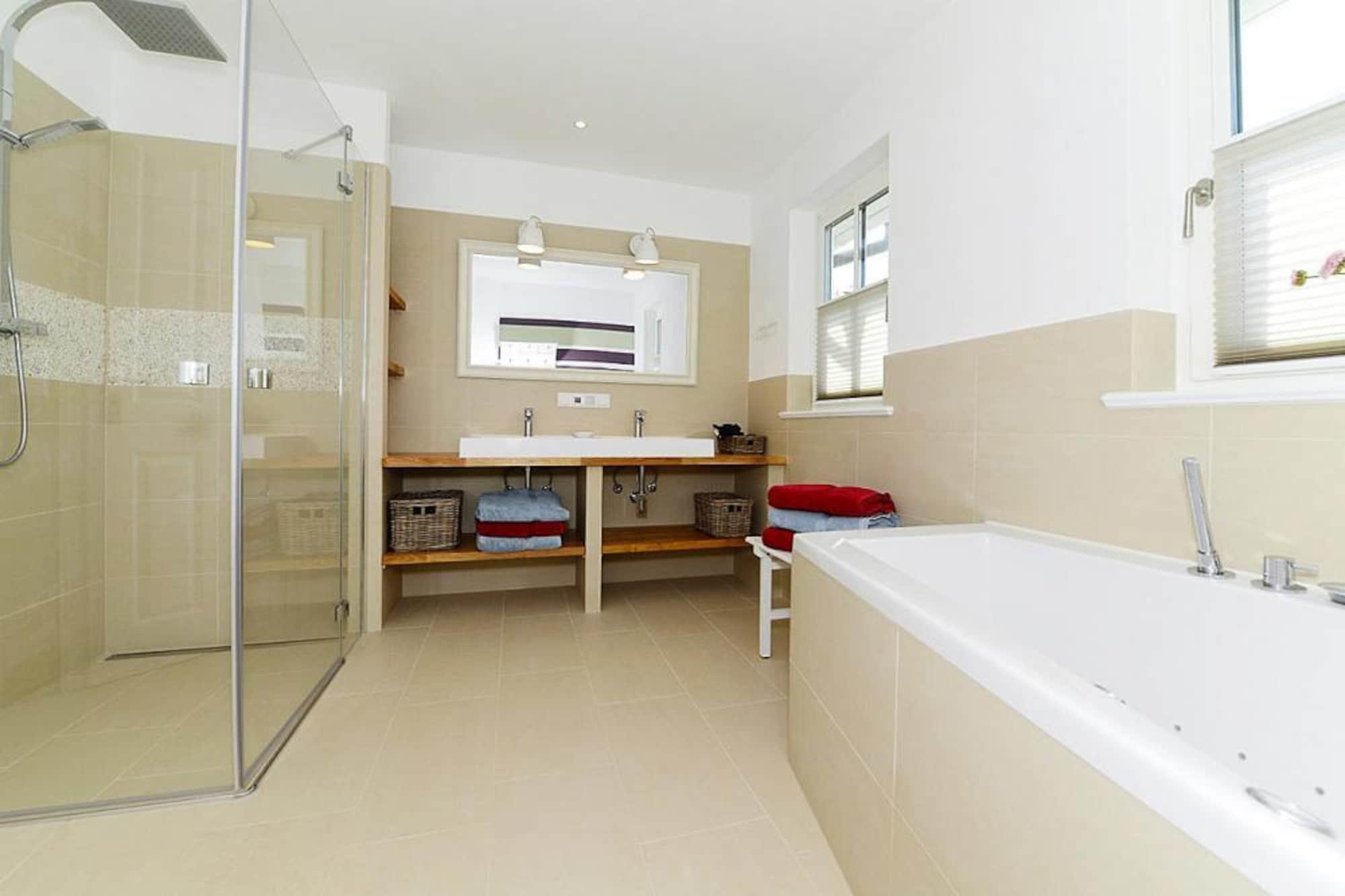 In der 1. Etage: (offene Küche(Esstisch, Kochplatte(4 Kochplatten, Ceranfeld), Wasserkocher, Toaster, Kaffeemaschine, Backofen, Mikrowelle, Spülmaschine, Kühl-/Gefrierkombination, Mixer), Wohn/Esszimmer(TV(Satellit), Kaminofen, DVD-Spieler, Radio, Stereoanlage), Schlafzimmer(Doppelbett(Boxspring, 180 x 200 cm)), Schlafzimmer(2x Einzelbett(90 x 190 cm)), Badezimmer(Badewanne, Dusche, Waschbecken, Waschbecken, Toilette, Föhn), Badezimmer(Dusche, Waschbecken, Toilette)) Souterrain: (Waschraum, Sauna(Dusche), Toilette) Sitzecke, Grill, Trockner, Sauna, Waschmaschine, Balkon, Heizung(Fußbodenheizung), Garten, Fahrradabstellraum, Gartenmöbel, Parkplatz, Sonnenschirm, Hochstuhl, Ladestation für Elektroautos, Babybett (kostenpflichtig)