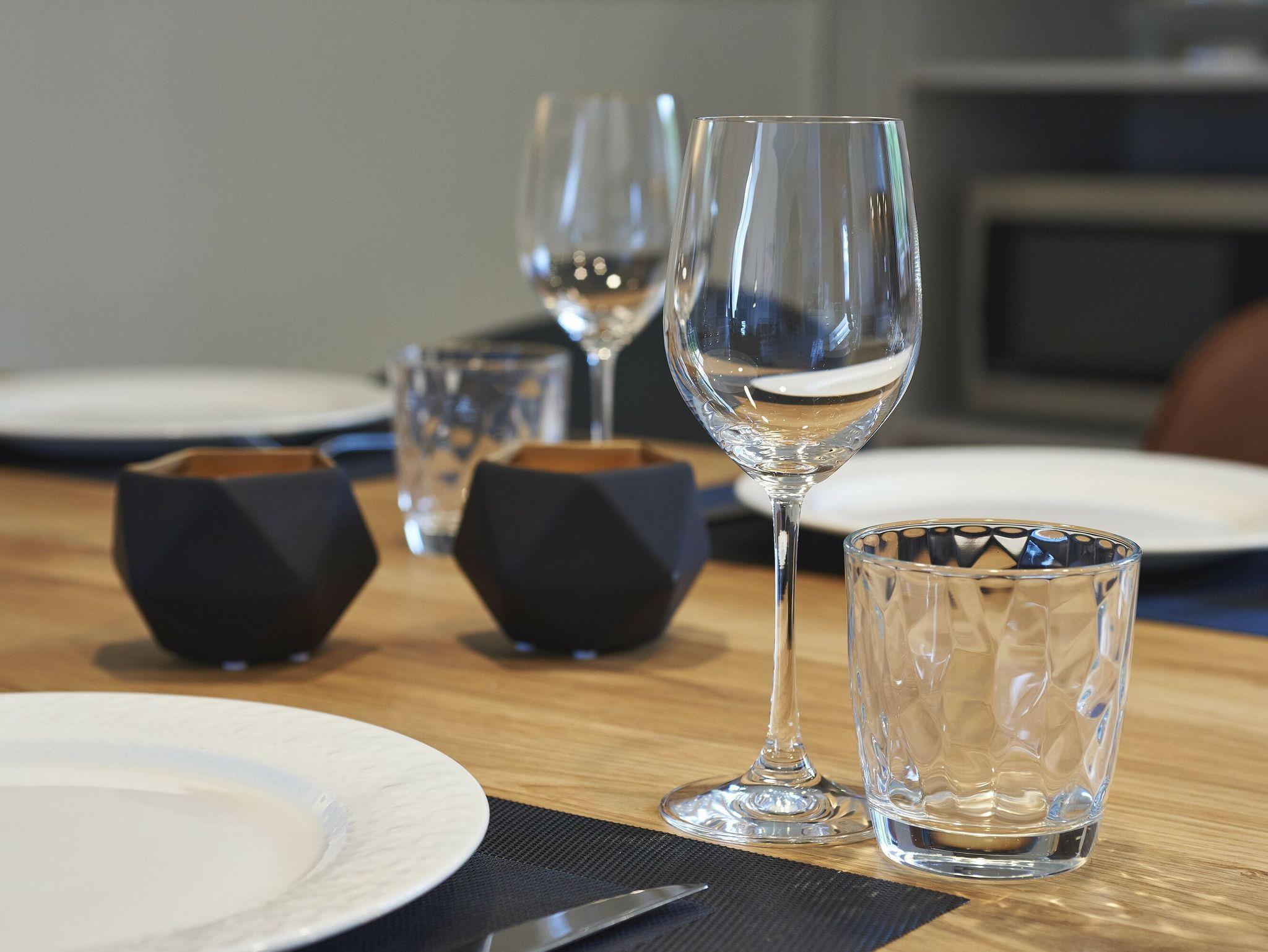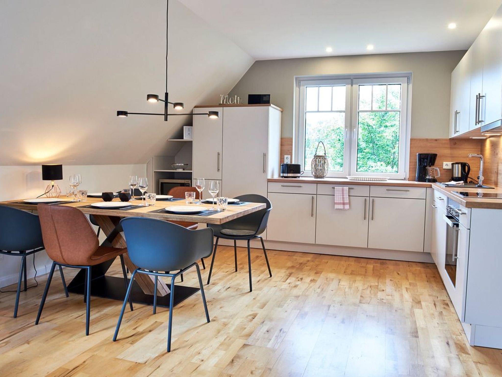 Die durchdachte Aufteilung der Wohnung schafft drei separate Schlafbereiche, welche durch eine großzügige, einladende Wohnküche verbunden sind. Diese ist mit einer modernen Einbauküche ausgestattet, die viel Raum für gemeinsames Kochen bietet. Genießen Sie Ihre Mahlzeiten an einem großen Holztisch oder entspannen Sie in der gemütlichen Sitzecke mit Fernseher.