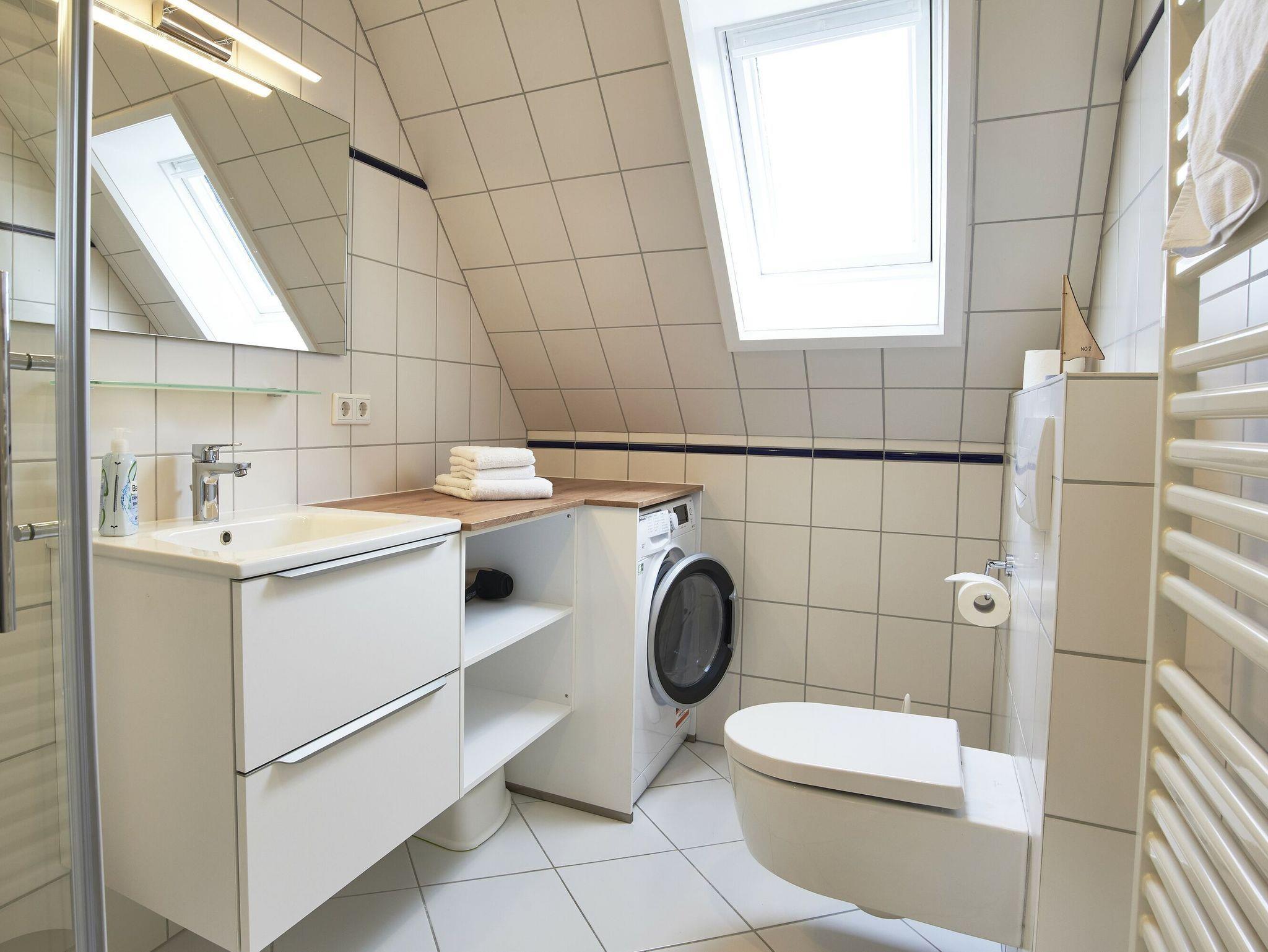 Der kleinere Schlafbereich verfügt über ein behagliches Schlafzimmer mit Doppelbett, ein Bad mit Regendusche sowie einen Flur mit Garderobe. Der größere Schlafbereich bietet neben einem hellen Schlafzimmer mit Doppelbett ein weiteres Schlafzimmer mit zwei Einzelbetten, ein Duschbad mit Regendusche und Waschtrockner.
