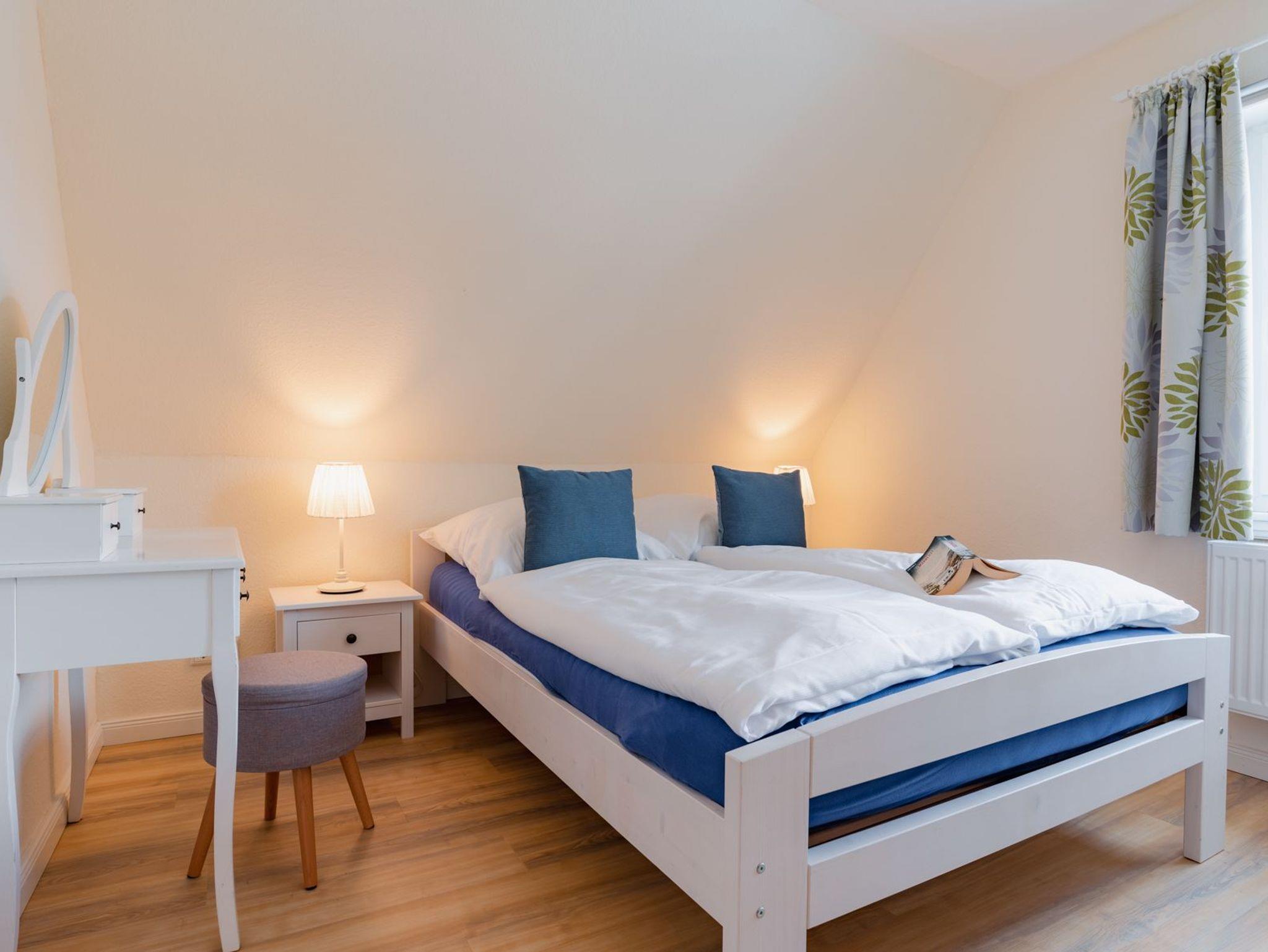 Die Wohnung ist gemütlich eingerichtet. Im Wohnzimmer steht ein Flat-TV zur Verfügung, falls man mal nicht zum Strand möchte. Das Badezimmer ist mit einer Dusche ausgestattet und verfügt über eine Waschmachine. Die Küche bietet genügend Platz für 4 Personen und hat für Kleinkinder einen Kinderhochstuhl. In beiden Schlafzimmern befinden sich Doppelbetten, in dem großen Schlafzimmer steht ein 180 x 200 cm Bett und in dem kleinen Schlafzimmer ein 140 x 200 cm Bett. Im kleinen Schlafzimmer steht außerdem ein Schminktisch.