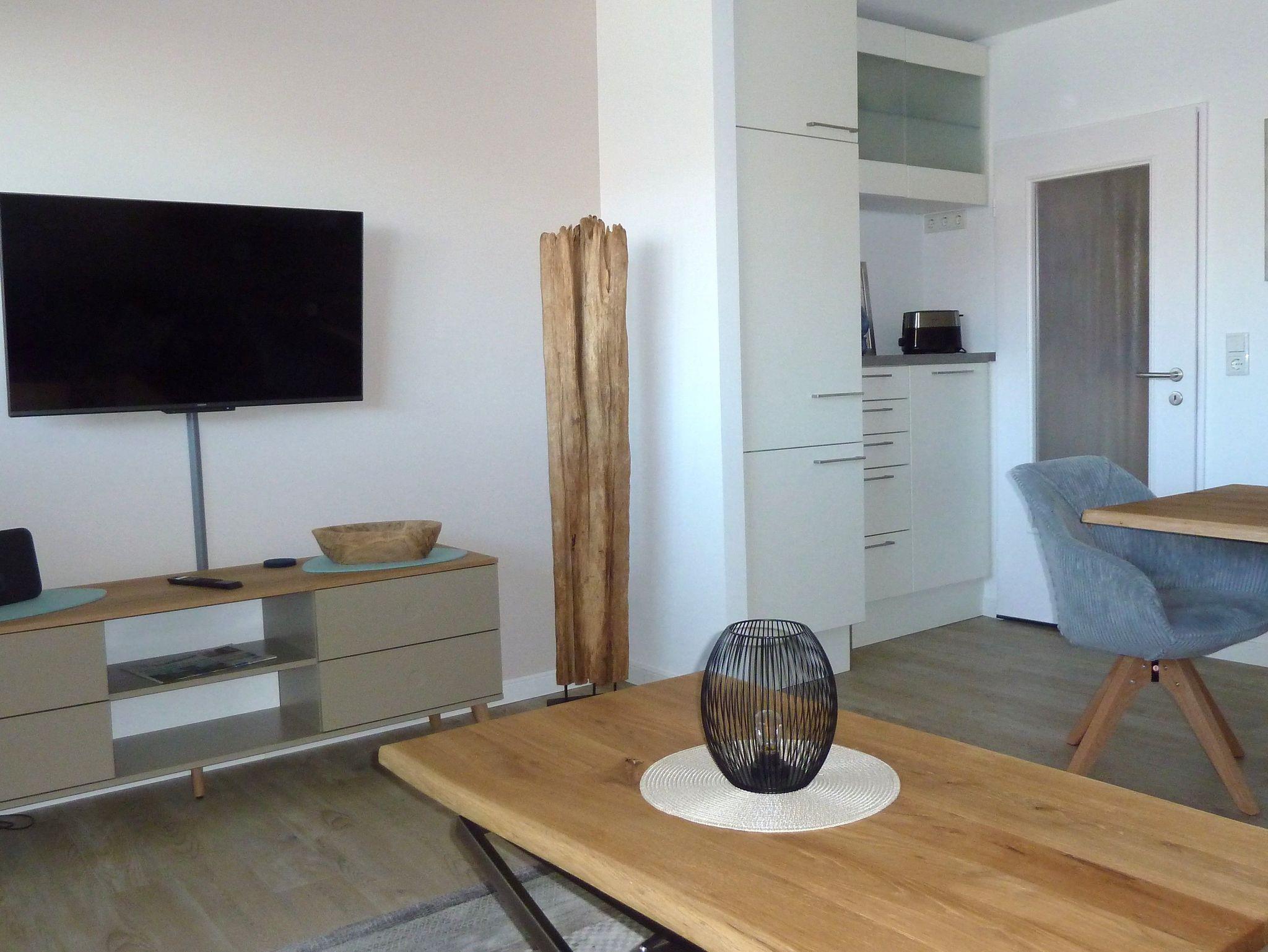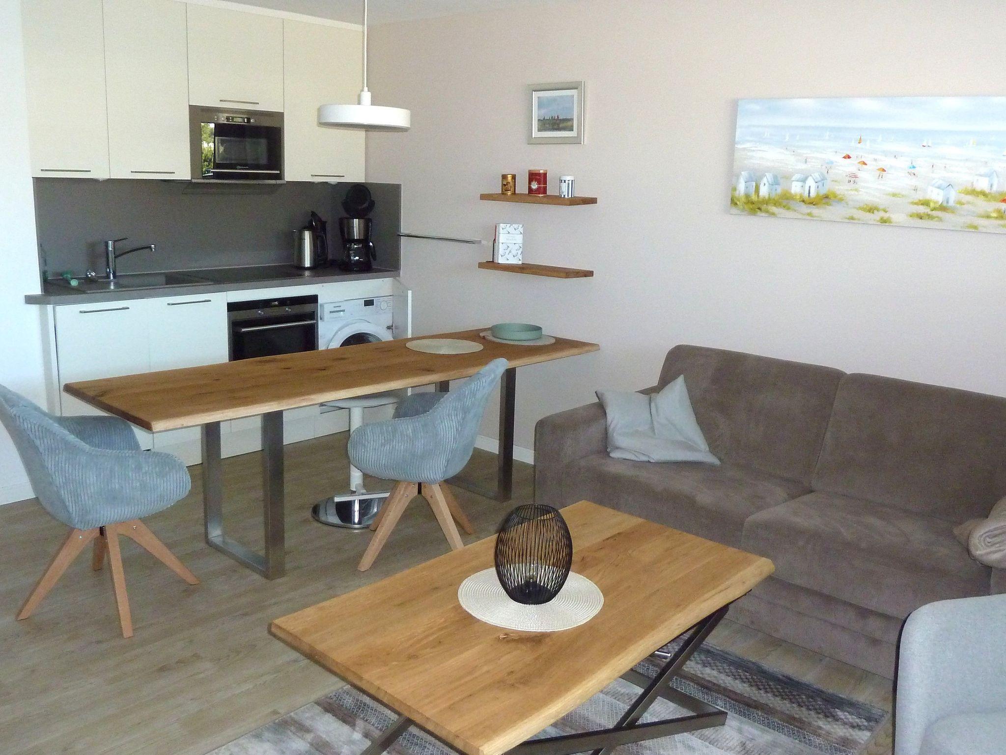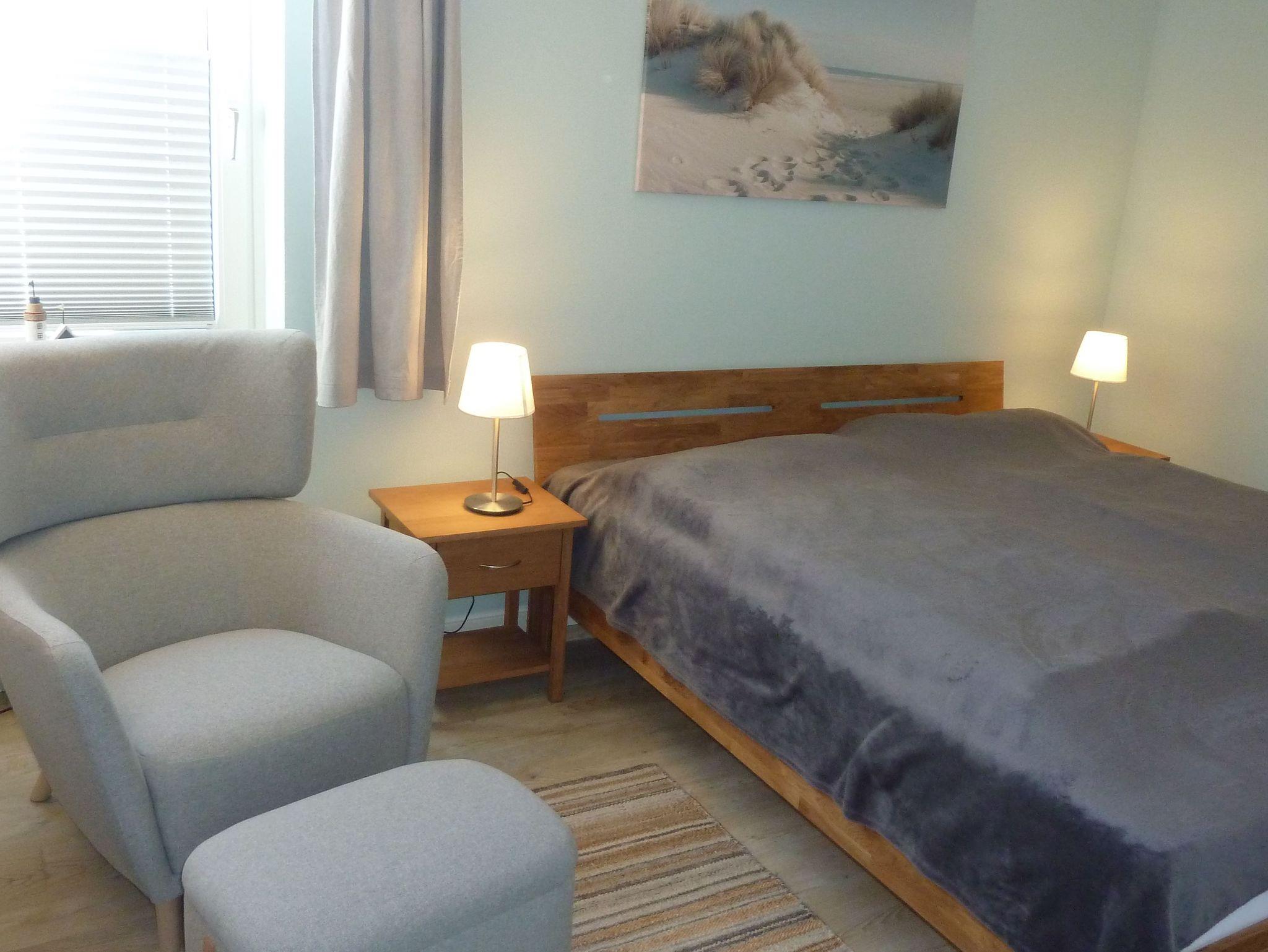 Die strandnahe und helle Ferienwohnung im Hochpaterre bietet Platz für zwei bis drei Personen. Zusätzlich zu dem separaten Schlafzimmer mit einem Doppelbett hat eine Person die Möglichkeit das Schlafsofa zu nutzen. Zudem verfügt die Wohnung über ein gemütliches Wohnzimmer mit integrierter Küche. Hier können Sie die Waschmaschine kostenfrei nutzen.