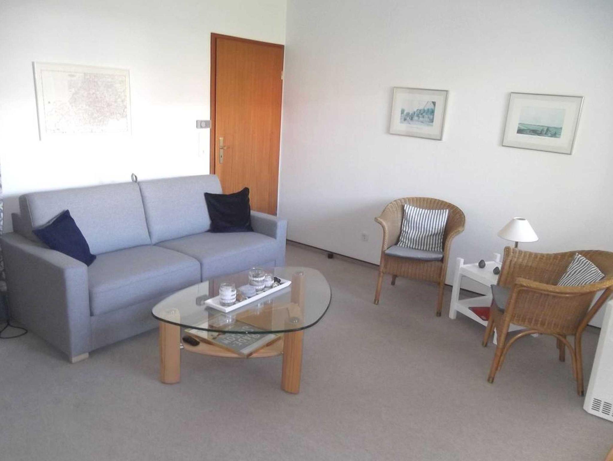 Die 45 qm große Ferienwohnung verfügt über ein separates Schlafzimmer mit einem Doppelbett, ein Wohnzimmer mit Essecke und integrierter Küche, ein Duschbad. Vom Wohnzimmer aus gelangt man auf den Süd-Westlich ausgerichteten Balkon. Die Fahrräder können in einem Fahrradabstellraum im Keller untergebracht werden, auch ein Stellplatz für den PKW gehört zum Objekt.