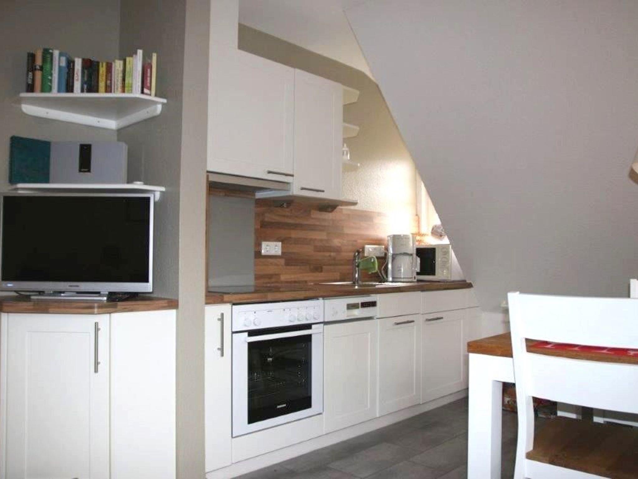 Die im ersten OG liegende 45m² große Wohnung verfügt über ein Duschbad, ein separates Schlafzimmer, einem offenen kombinierten Wohn- und Essraum (mit Schlafsofa) und einliegender Einbauküche. In der Küche sind Geschirrspüler, Backofen, Mikrowelle und eine Kaffeemaschine vorhanden.