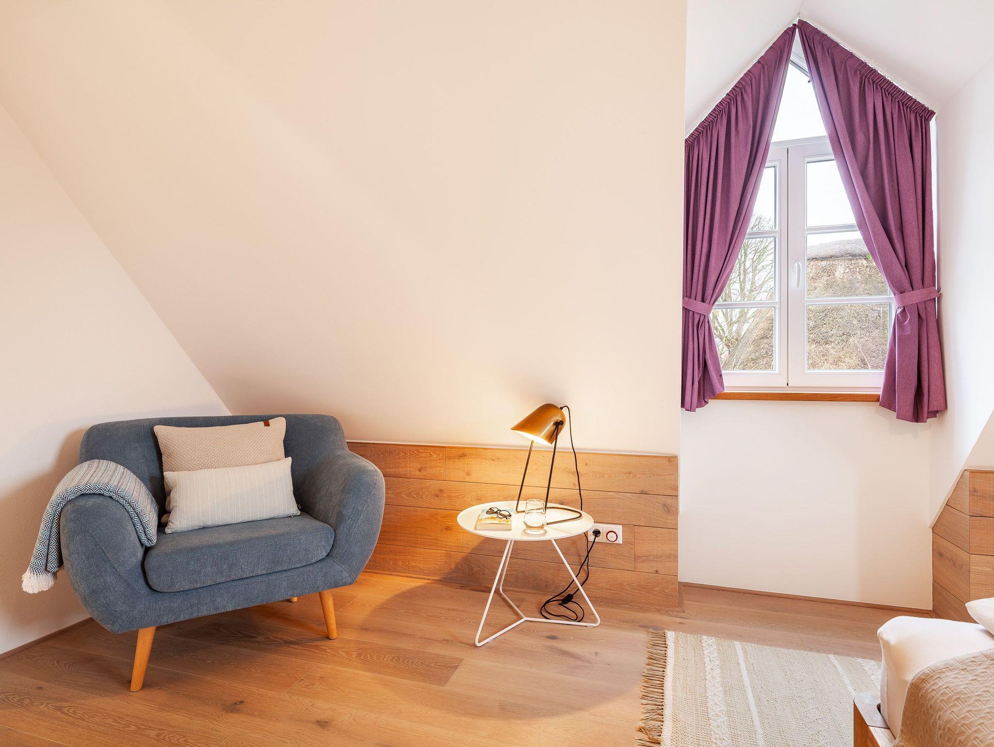 Über die Rohbetontreppe gelangen Sie in das Obergeschoss. Eine offene Galerie mit Schreibtisch, zwei Doppelschlafzimmer mit Fernseher und ein Bad mit Wanne und Dusche erwarten Sie hier.