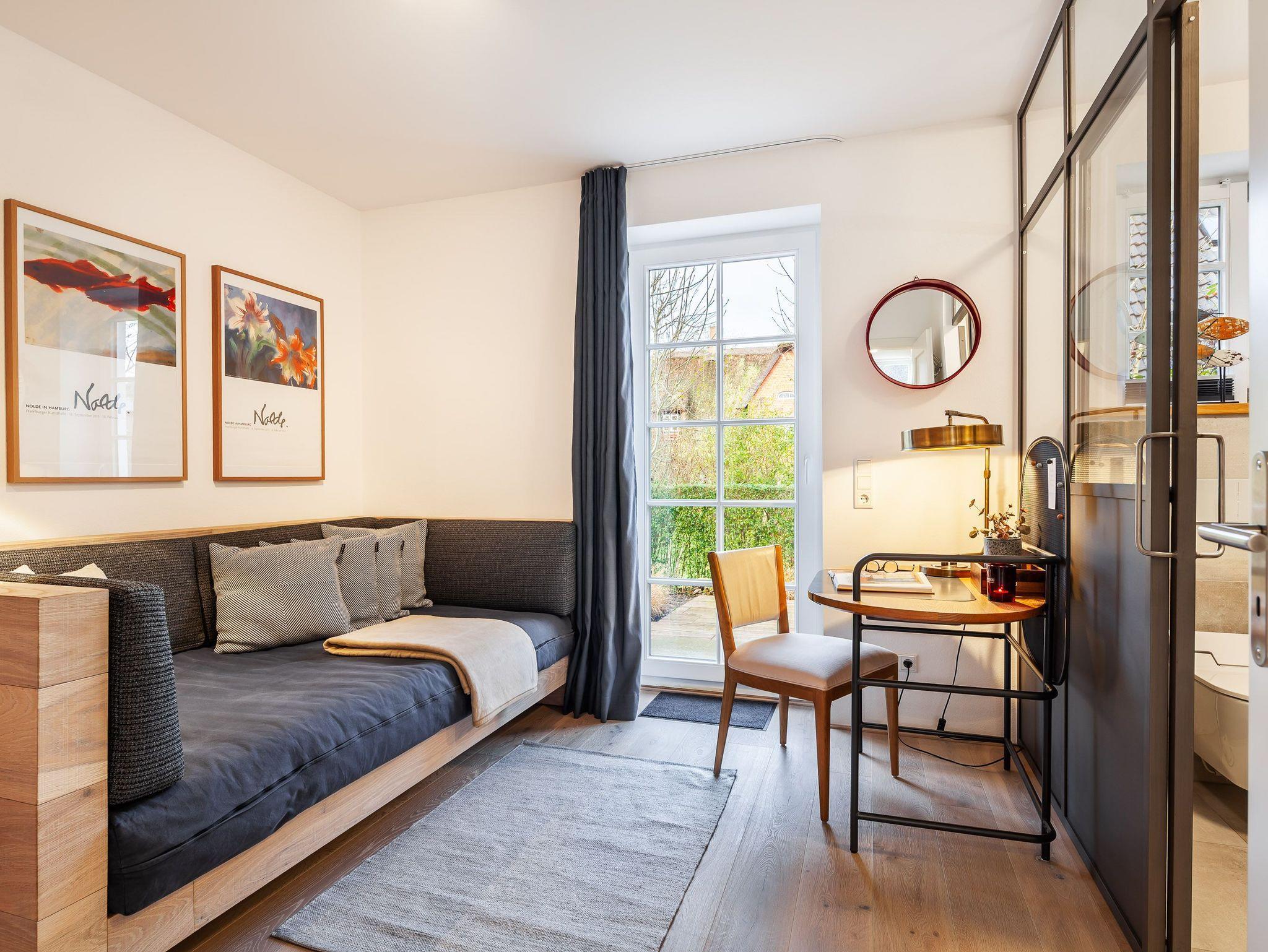Eichenparkett, hochwertiges Mobiliar, Holzelemente und Betonoptik bilden einen harmonischen Einklang.