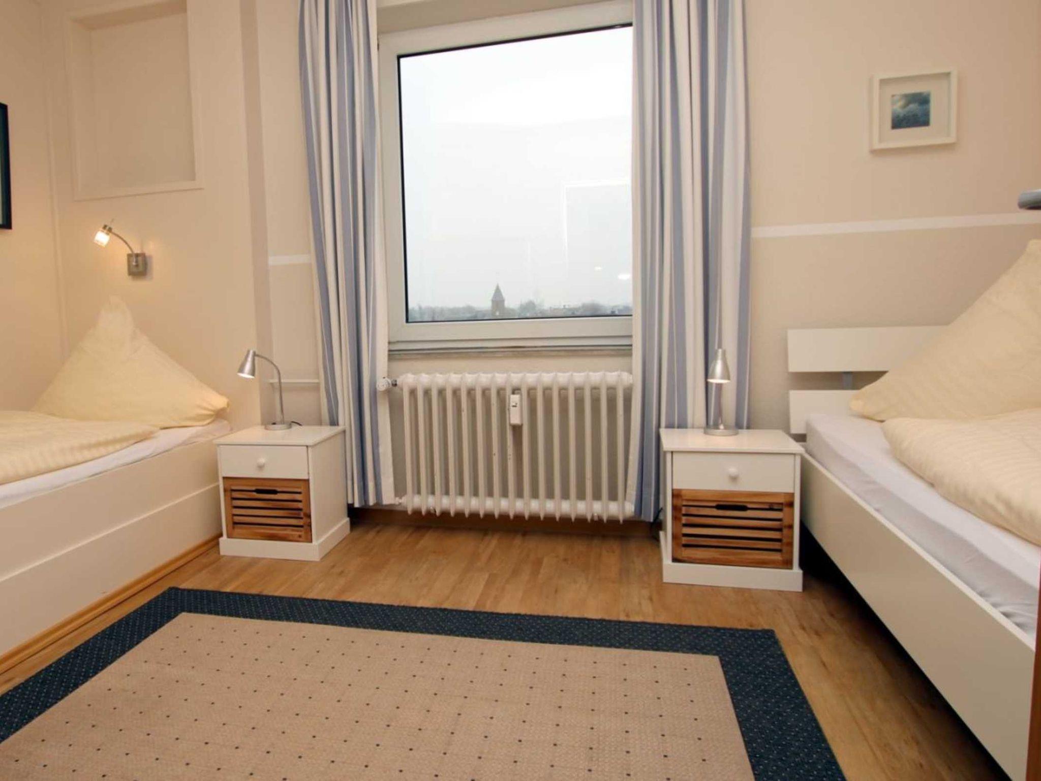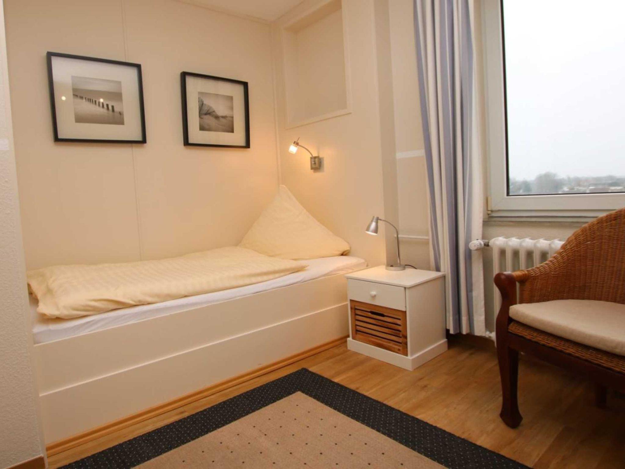 Die helle Wohnung liegt im fünften Stock und ist mit dem Aufzug erreichbar. Durch das große Panoramafenster im Wohnraum hat man einen wundervollen, direkten Blick auf die Halligen und den Sandwall. Das Appartement verfügt über ein separates Schlafzimmer mit zwei Einzelbetten, einen gemütlichen Wohn-Schlafraum, einer gut ausgestatteten Küche und einem Duschbad.