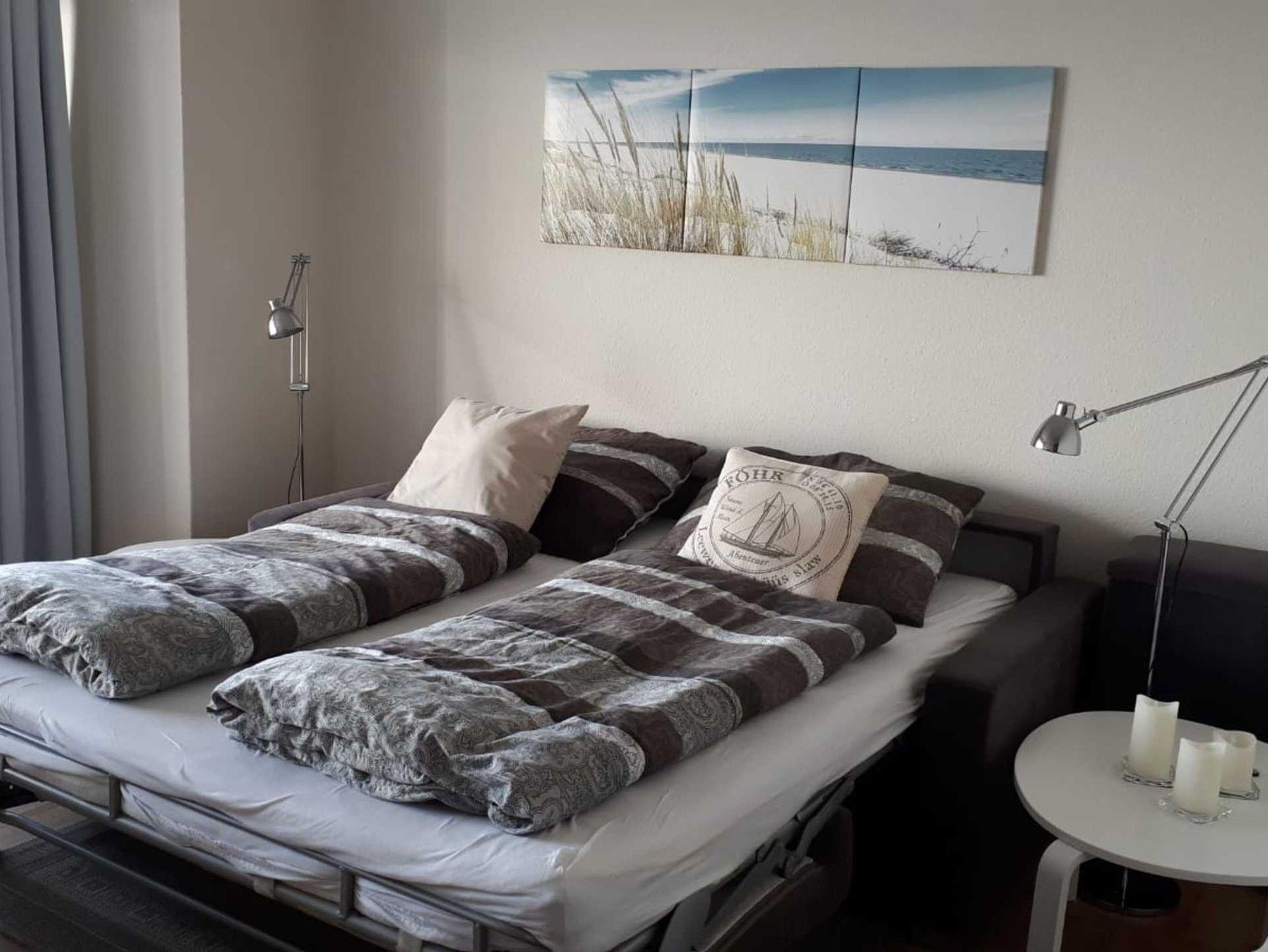 Im Schlafzimmer befinden sich 2 Einzelbetten, im Wohnzimmer ist das Schlafsofa mit zwei Lattenrosten.