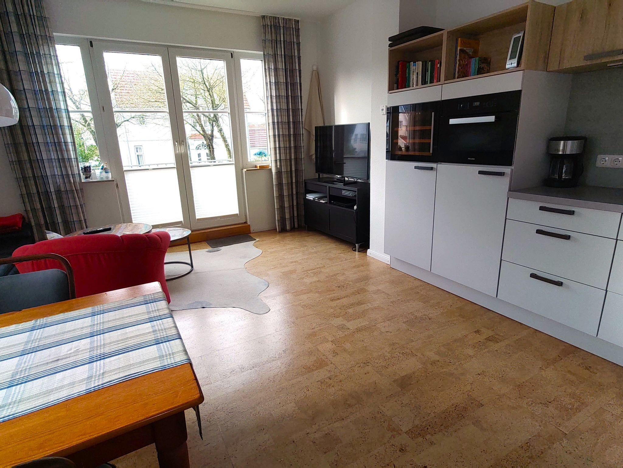 Das strandnah gelegene Stadthaus liegt am Südstrand und ist nur 200 Meter vom Badestrand entfernt. Die helle Hochparterrewohnung ist 40m² groß und hat einen schönen Balkon, den Sie vom Wohnzimmer aus erreichen können.