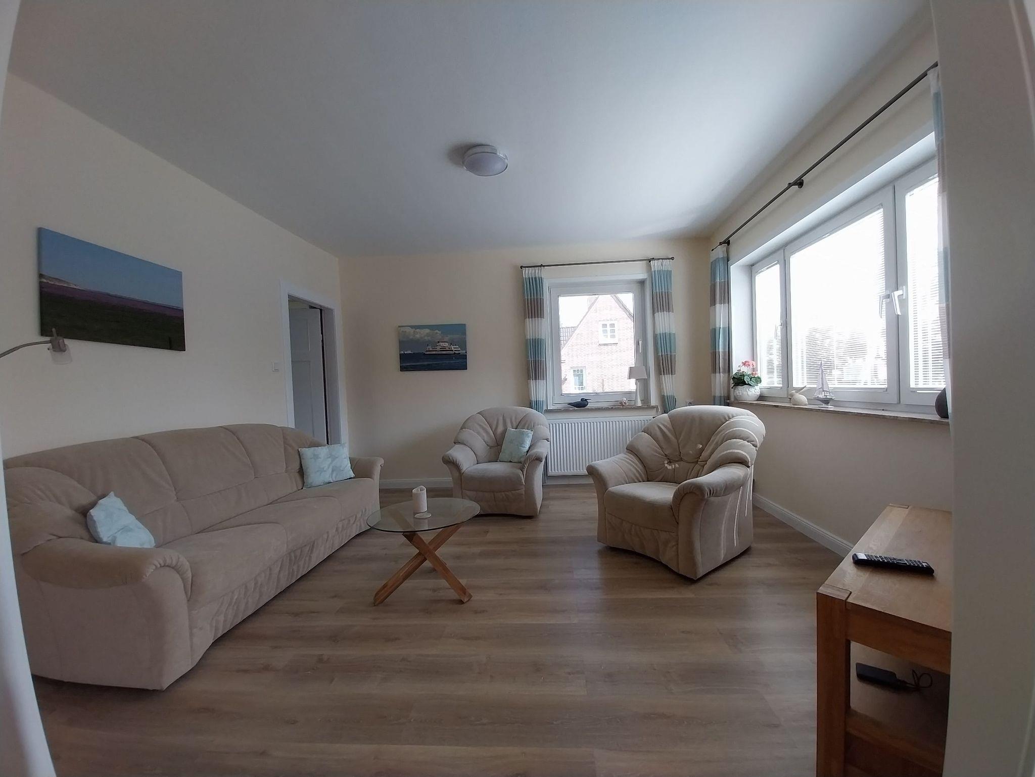 Diese lichtdurchflutete Wohnung erstreckt sich über beide Etagen des Hauses und steht zur alleinigen Nutzung zur Verfügung. Wohn- und Esszimmer gehen ineinander über und bieten viel Platz, um sich auch bei Regentagen wohl zu fühlen. Kinderzimmer (Boxspringbett 1,40 x 2,00 m), Elternschlafzimmer (Doppelbett 1,80 m x 2 m) und 1 Babybett