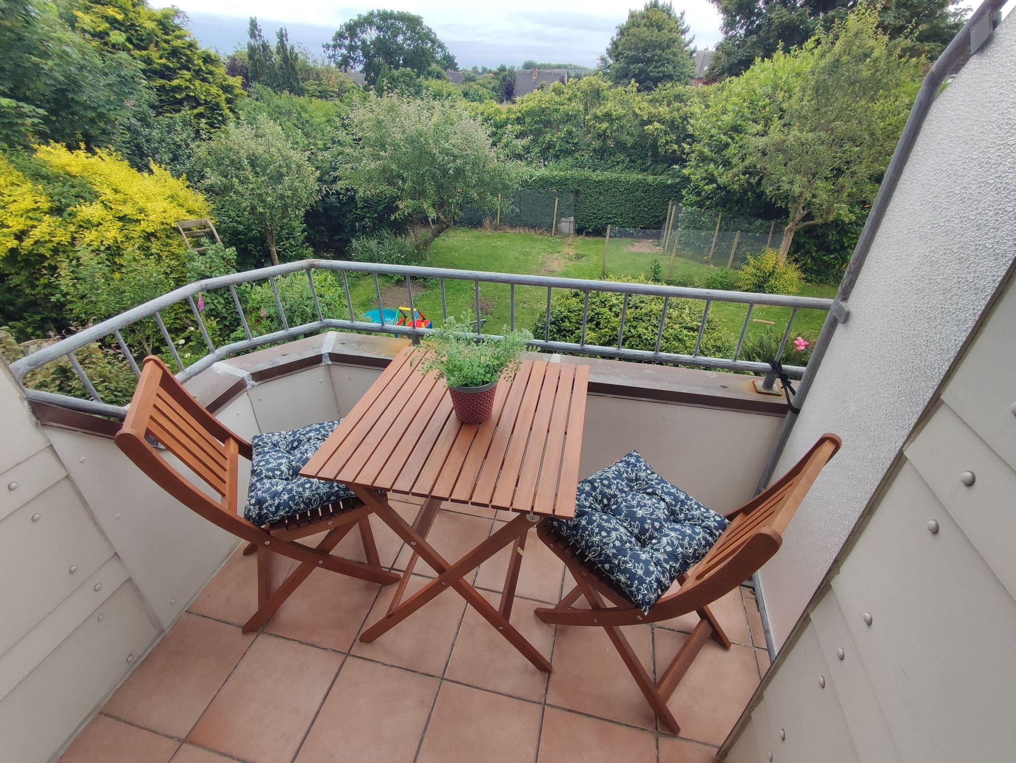 Balkon: Nach Süd-Süd-West ausgerichtet mit Tisch und zwei Stühlen.