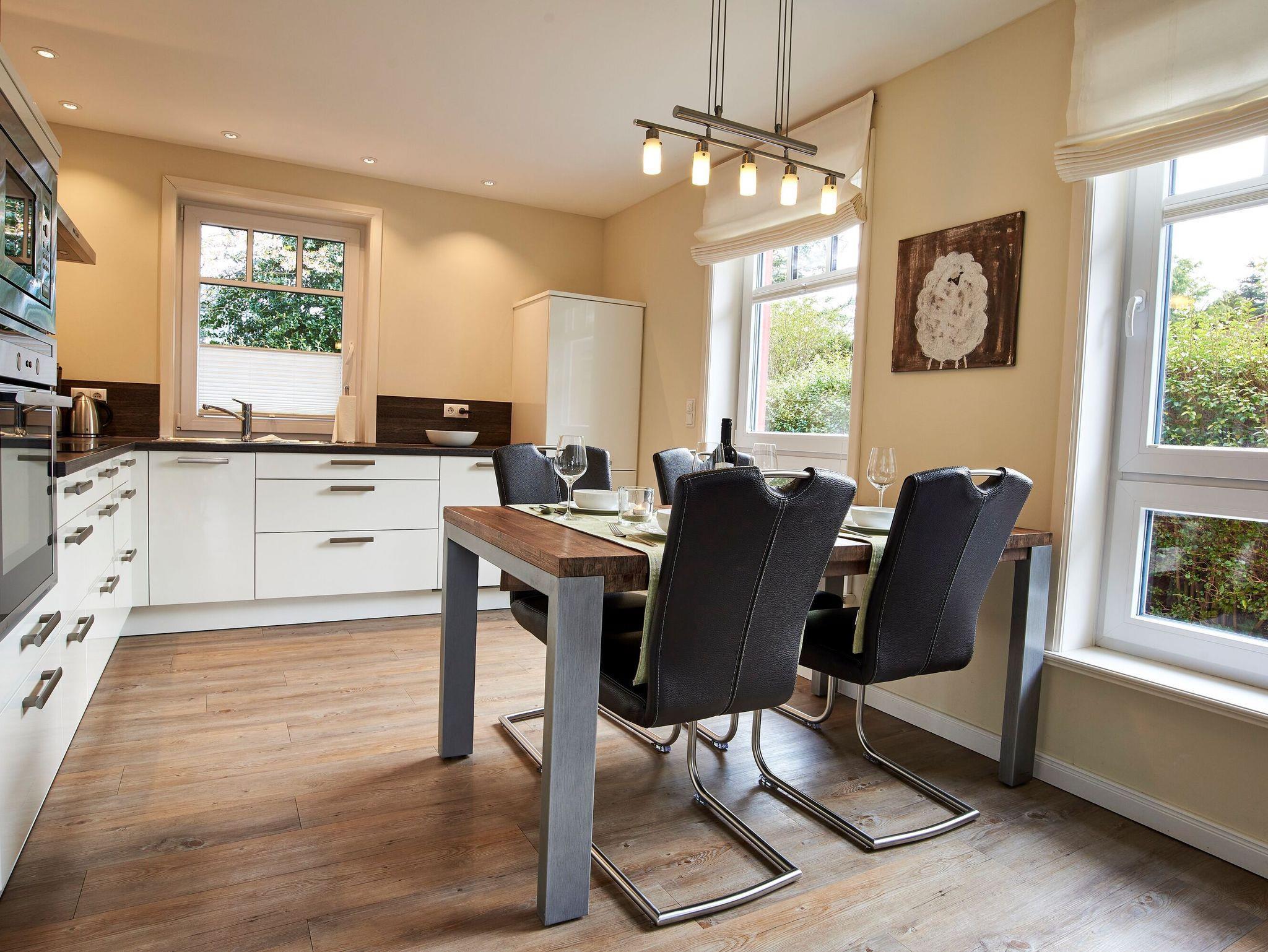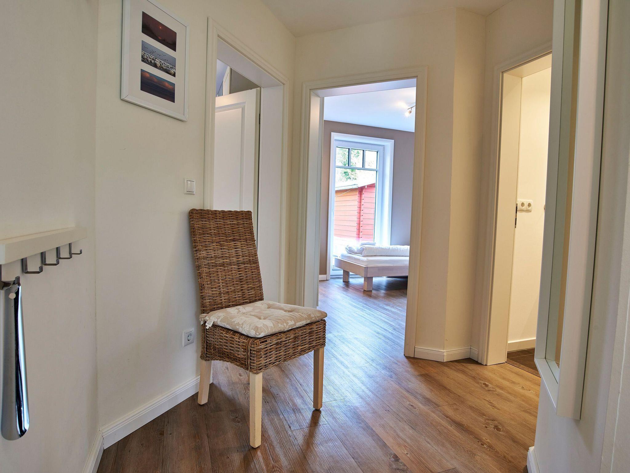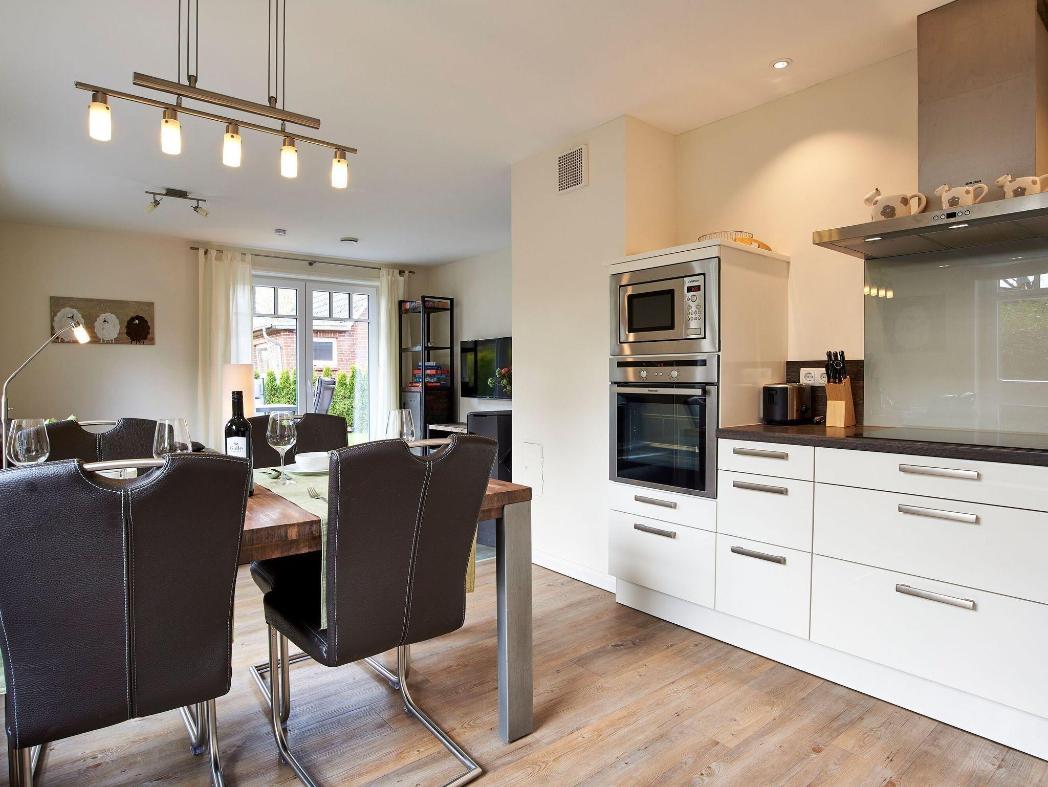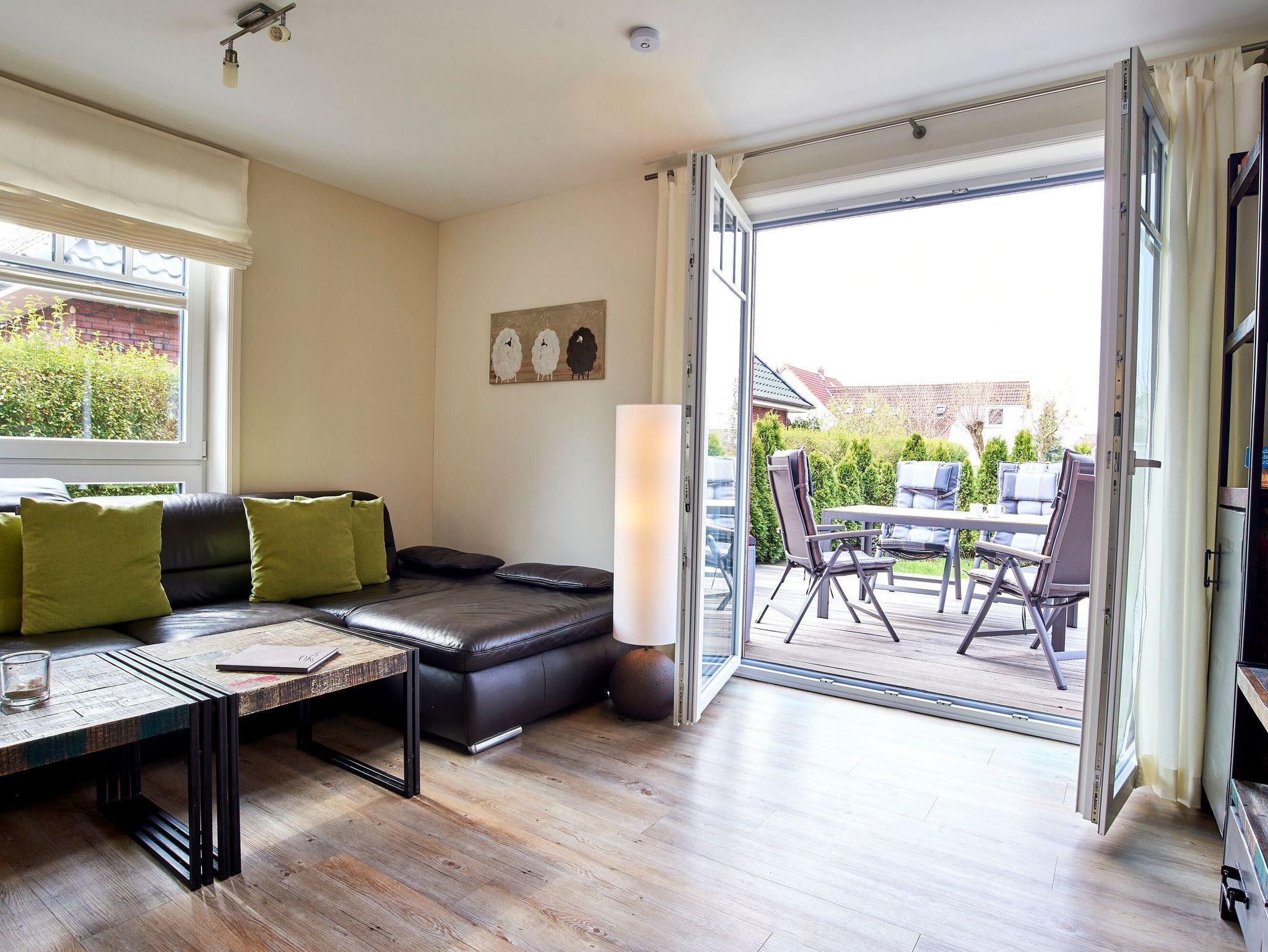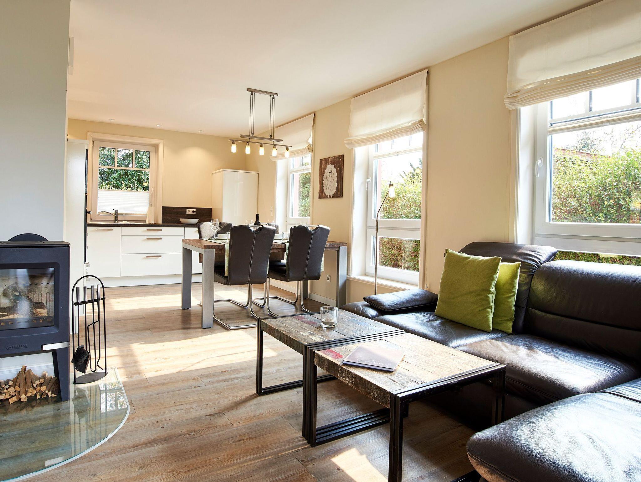 Moderne Ferienwohnung auf Föhr mit Kamin, Terrasse und Sauna, ideal für Familien und Haustierfreunde.