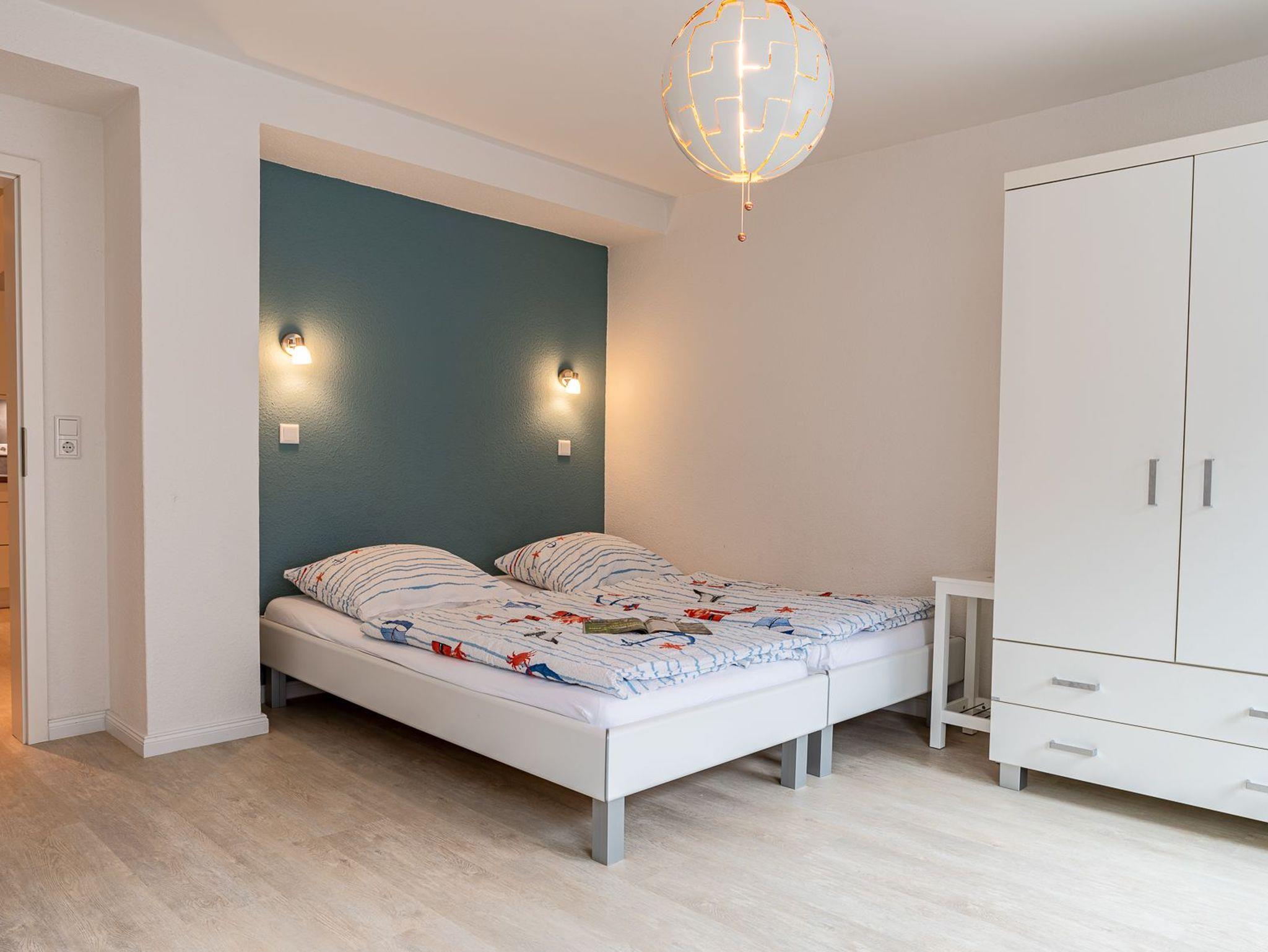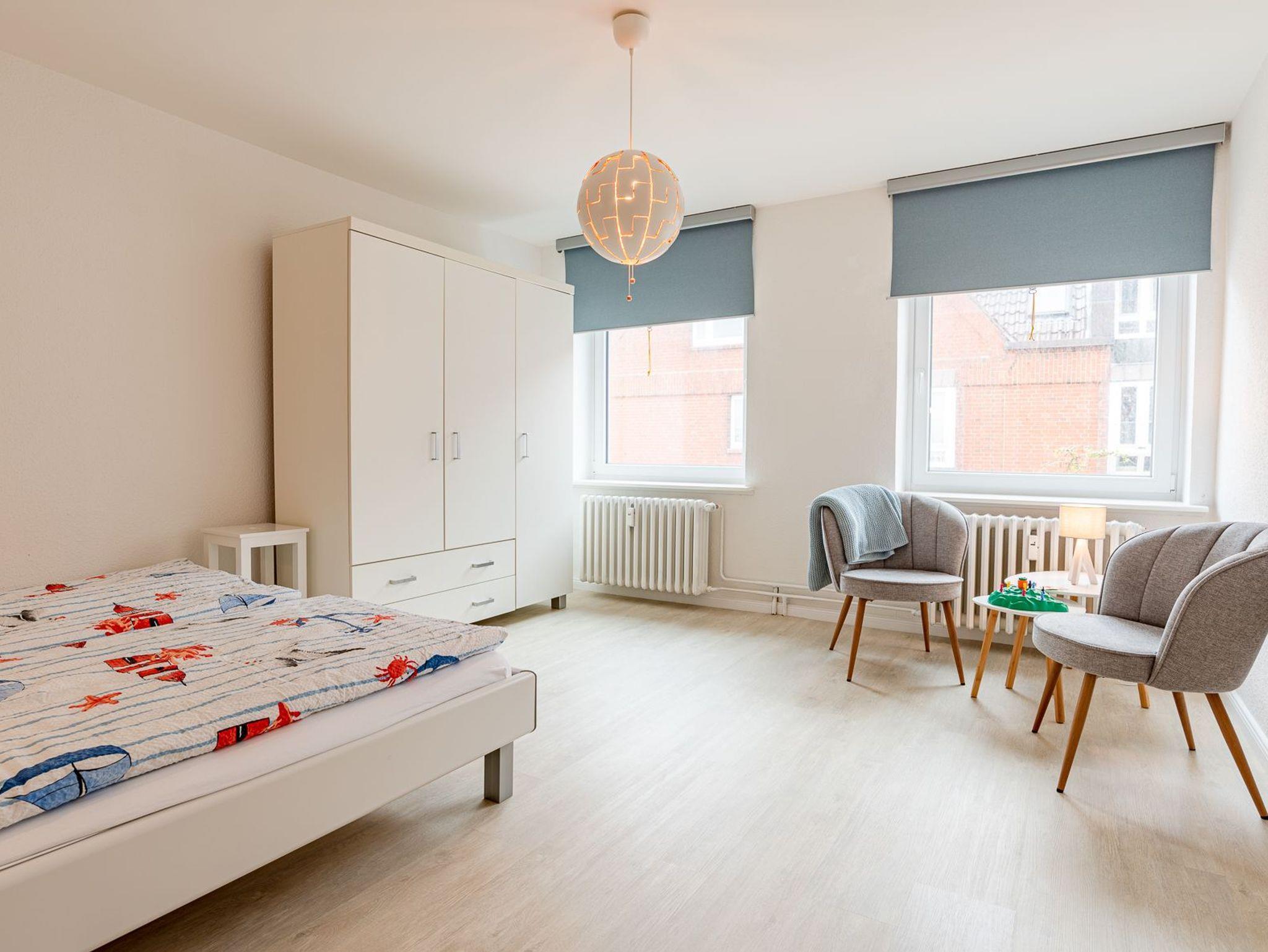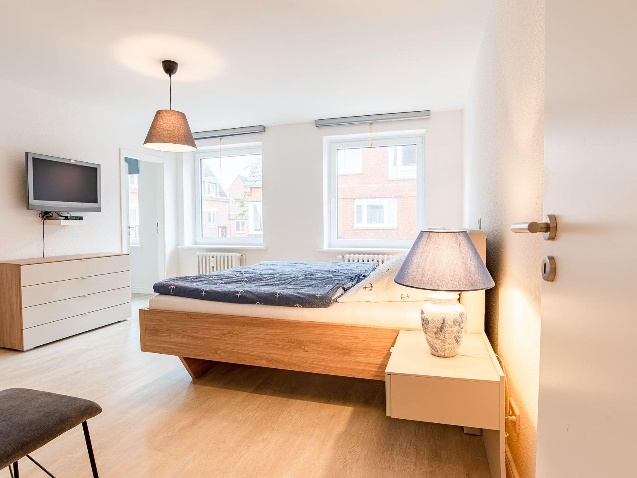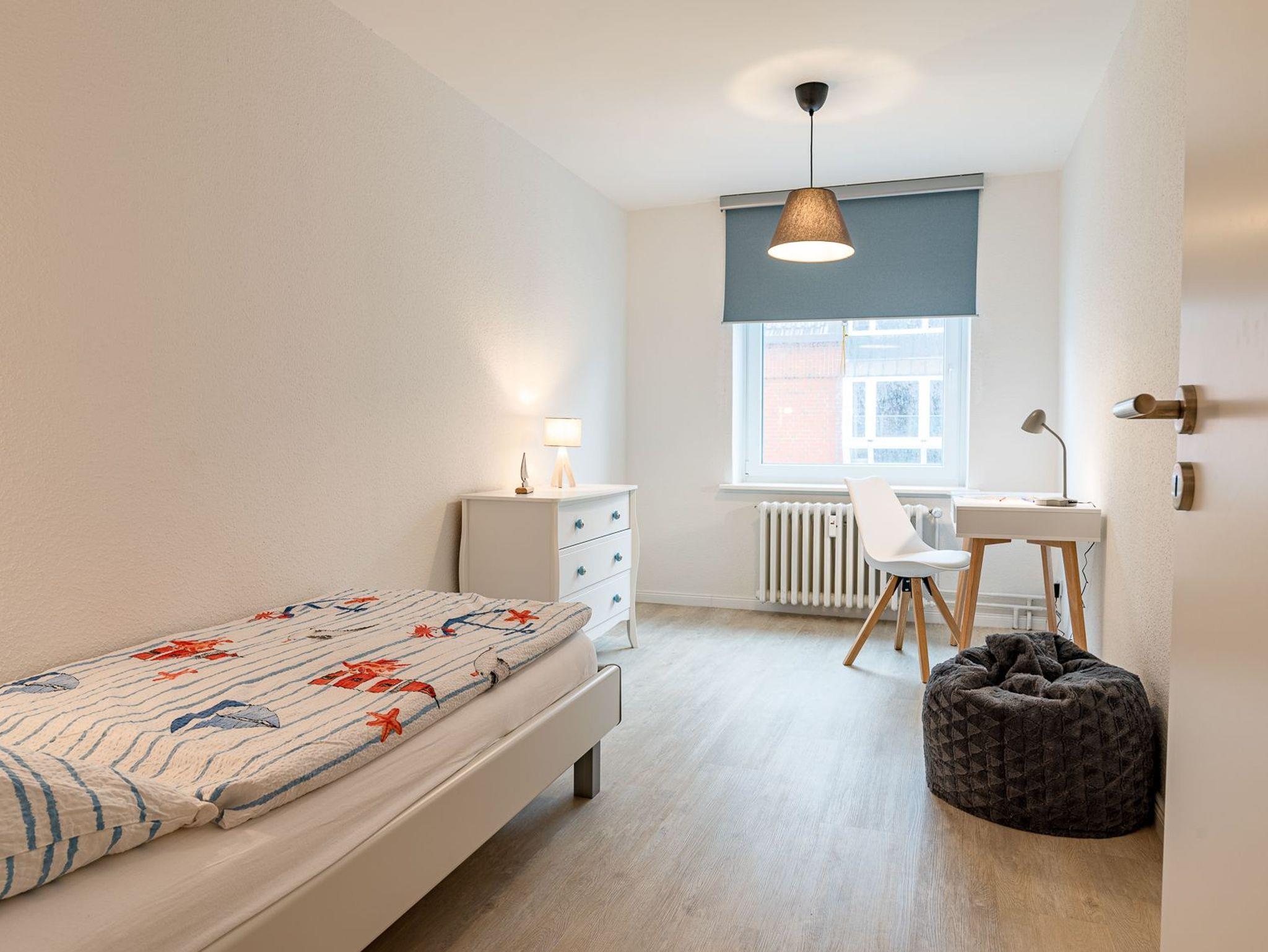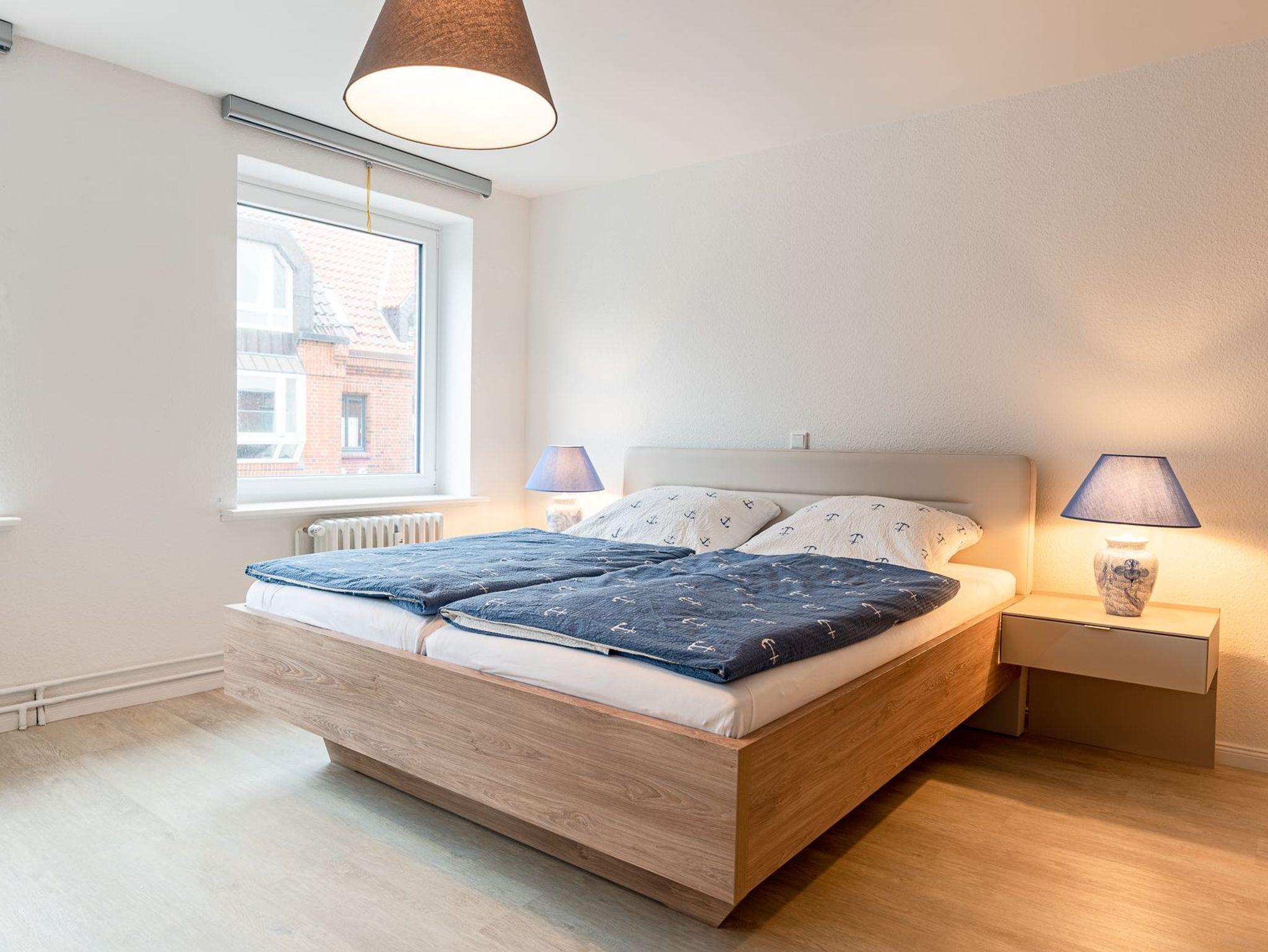 Diese exklusive Unterkunft befindet sich direkt am Sandwall von Wyk am Strand gelegen. Die Wohnung liegt im 1. OG und kann über einen Personenaufzug im Treppenhaus des Mehrfamilienhauses erreicht werden. Die offen gestaltete Wohnung verfügt über ein großes Schlafzimmer mit Doppelbett, ein geräumiges Schlafzimmer mit zwei Einzelbetten und einem Schlafzimmer mit Einzelbett. Es befinden sich ein Duschbad und ein extra Gäste-WC, in dem auch eine Waschmaschine und ein Trockner stehen, in der Wohnung. Die offene Wohnküche mit großem Esstisch geht fliessend in den Wohnzimmerbereich über. Vom Wohnzimmer aus hat man einen seitlichen Blick aufs Meer und die neue Mittelbrücke.