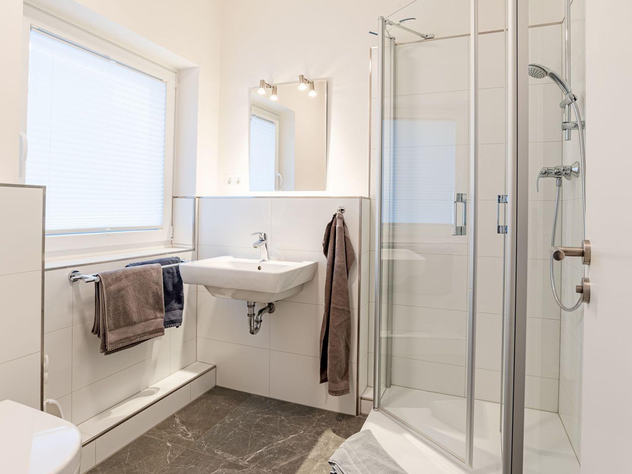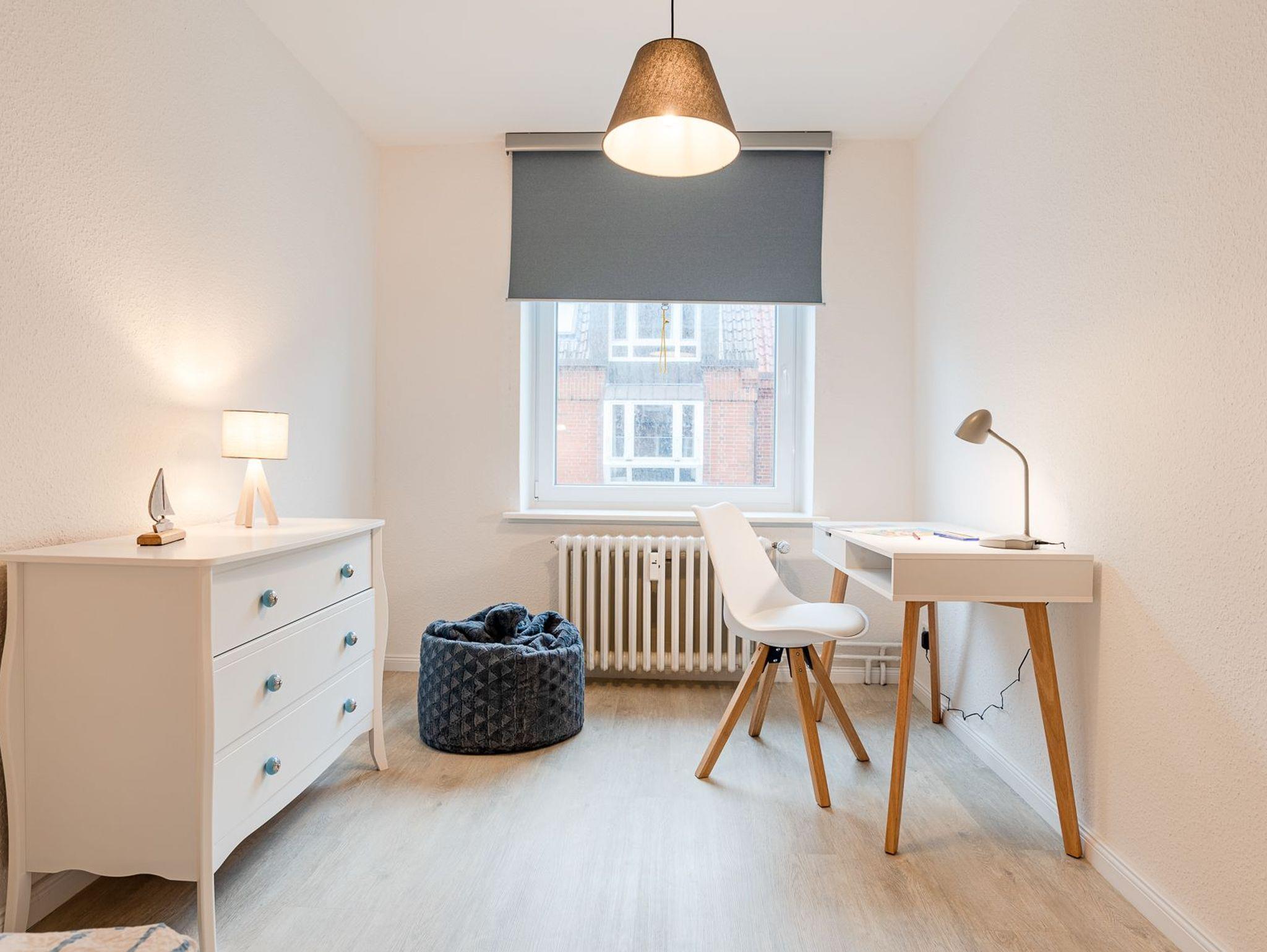 Diese exklusive Unterkunft befindet sich direkt am Sandwall von Wyk am Strand gelegen. Die Wohnung liegt im 1. OG und kann über einen Personenaufzug im Treppenhaus des Mehrfamilienhauses erreicht werden. Die offen gestaltete Wohnung verfügt über ein großes Schlafzimmer mit Doppelbett, ein geräumiges Schlafzimmer mit zwei Einzelbetten und einem Schlafzimmer mit Einzelbett. Es befindet sich ein Duschbad und ein extra Gäste-WC, in dem auch eine Waschmaschine und ein Trockner stehen, in der Wohnung. Die offene Wohnküche mit großem Esstisch geht fliessend in den Wohnzimmerbereich über. Vom Wohnzimmer aus hat man einen seitlichen Blick aufs Meer und die neue Mittelbrücke.